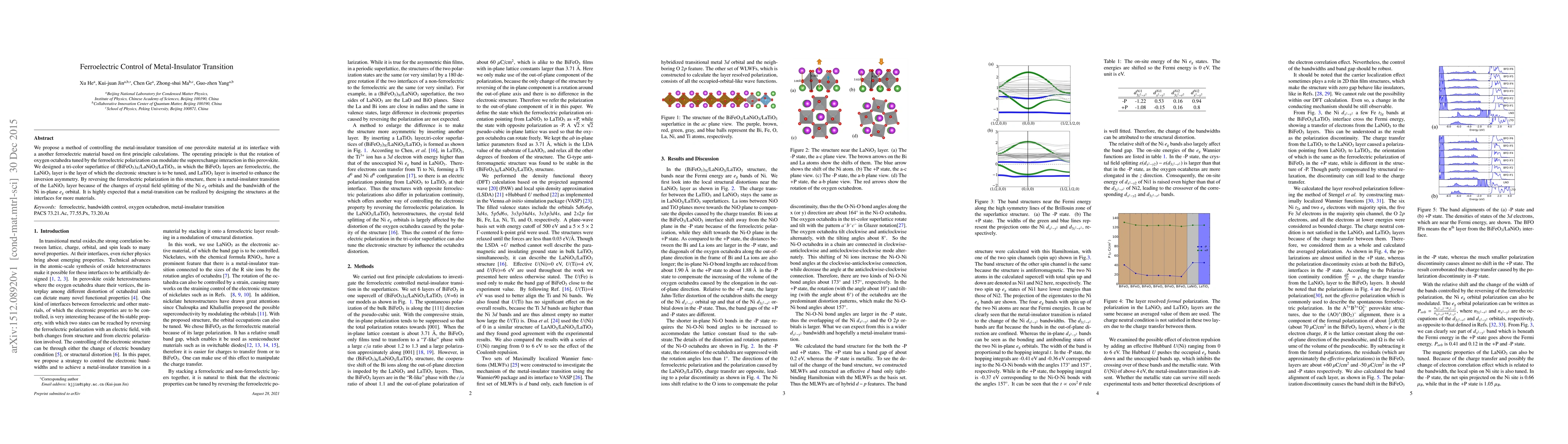 We propose a method of controlling the metal-insulator transition of one perovskite material at its interface with a another ferroelectric material based on first principle calculations. The operating principle is that the rotation of oxygen octahedra tuned by the ferroelectric polarization can modulate the superexchange interaction in this perovskite. We designed a tri-color superlattice of (BiFeO$_3$)$_N$/LaNiO$_3$/LaTiO$_3$, in which the BiFeO$_3$ layers are ferroelectric, the LaNiO$_3$ layer is the layer of which the electronic structure is to be tuned, and LaTiO$_3$ layer is inserted to enhance the inversion asymmetry. By reversing the ferroelectric polarization in this structure, there is a metal-insulator transition of the LaNiO$_3$ layer because of the changes of crystal field splitting of the Ni $e_g$ orbitals and the bandwidth of the Ni in-plane $e_g$ orbital. It is highly expected that a metal-transition can be realized by designing the structures at the interfaces for more materials.