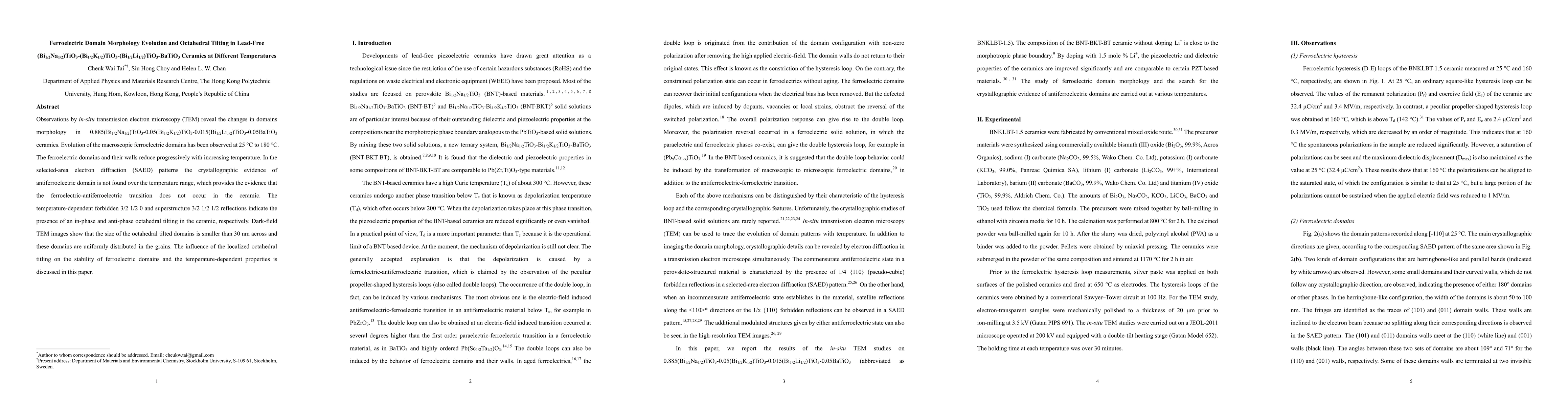 Observations by in-situ transmission electron microscopy (TEM) reveal the changes in domains morphology in 0.885(Bi1/2Na1/2)TiO3-0.05(Bi1/2K1/2)TiO3-0.015(Bi1/2Li1/2)TiO3-0.05BaTiO3 ceramics. Evolution of the macroscopic ferroelectric domains has been observed at 25 oC to 180 oC. The ferroelectric domains and their walls reduce progressively with increasing temperature. In the selected-area electron diffraction (SAED) patterns the crystallographic evidence of antiferroelectric domain is not found over the temperature range, which provides the evidence that the ferroelectric-antiferroelectric transition does not occur in the ceramic. The temperature-dependent forbidden 3/2 1/2 0 and superstructure 3/2 1/2 1/2 reflections indicate the presence of an in-phase and anti-phase octahedral tilting in the ceramic, respectively. Dark-field TEM images show that the size of the octahedral tilted domains is smaller than 30 nm across and these domains are uniformly distributed in the grains. The influence of the localized octahedral titling on the stability of ferroelectric domains and the temperature-dependent properties is discussed in this paper.