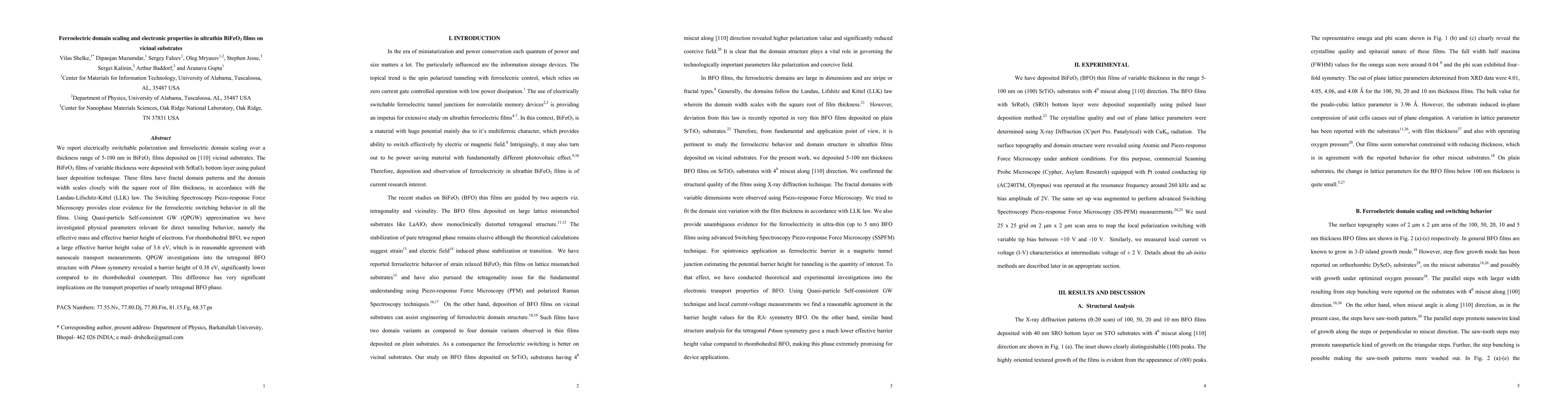 We report electrically switchable polarization and ferroelectric domain scaling over a thickness range of 5-100 nm in BiFeO3 films deposited on [110] vicinal substrates. The BiFeO3 films of variable thickness were deposited with SrRuO3 bottom layer using pulsed laser deposition technique. These films have fractal domain patterns and the domain width scales closely with the square root of film thickness, in accordance with the Landau-Lifschitz-Kittel (LLK) law. The Switching Spectroscopy Piezo-response Force Microscopy provides clear evidence for the ferroelectric switching behavior in all the films. Using Quasi-particle Self-consistent GW (QPGW) approximation we have investigated physical parameters relevant for direct tunneling behavior, namely the effective mass and effective barrier height of electrons. For rhombohedral BFO, we report a large effective barrier height value of 3.6 eV, which is in reasonable agreement with nanoscale transport measurements. QPGW investigations into the tetragonal BFO structure with P4mm symmetry revealed a barrier height of 0.38 eV, significantly lower compared to its rhombohedral counterpart. This difference has very significant implications on the transport properties of nearly tetragonal BFO phase.