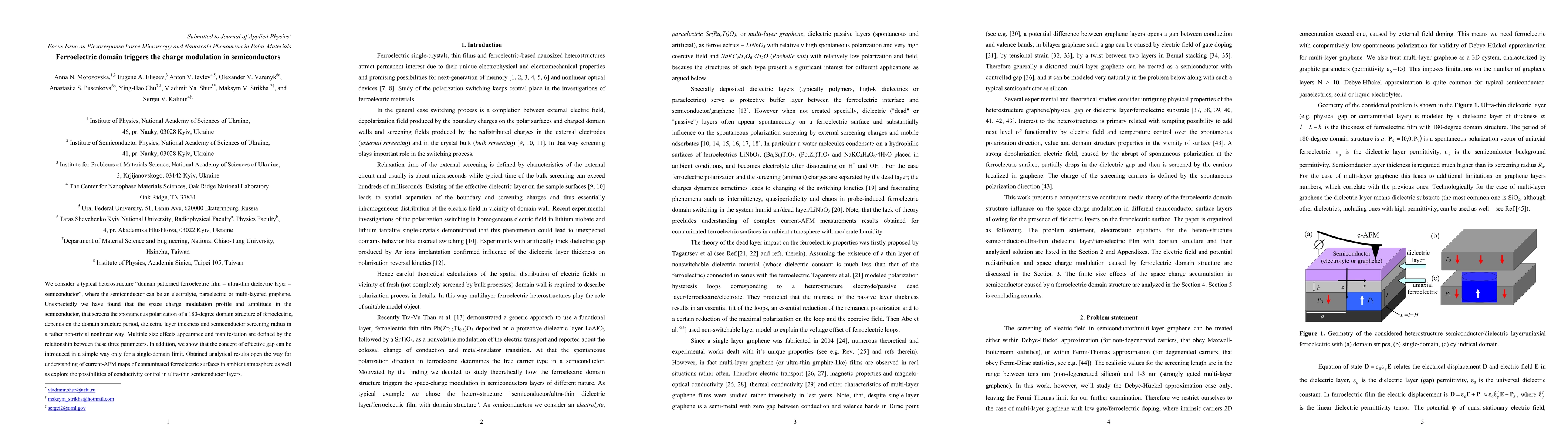 We consider a typical heterostructure domain patterned ferroelectric film/ultra thin dielectric layer/ semiconductor, where the semiconductor can be an electrolyte, paraelectric or multi layered graphene. Unexpectedly we have found that the space charge modulation profile and amplitude in the semiconductor, that screens the spontaneous polarization of a 180-degree domain structure of ferroelectric, depends on the domain structure period, dielectric layer thickness and semiconductor screening radius in a rather non-trivial nonlinear way. Multiple size effects appearance and manifestation are defined by the relationship between these three parameters. In addition, we show that the concept of effective gap can be introduced in a simple way only for a single domain limit. Obtained analytical results open the way for understanding of current AFM maps of contaminated ferroelectric surfaces in ambient atmosphere as well as explore the possibilities of conductivity control in ultra-thin semiconductor layers.