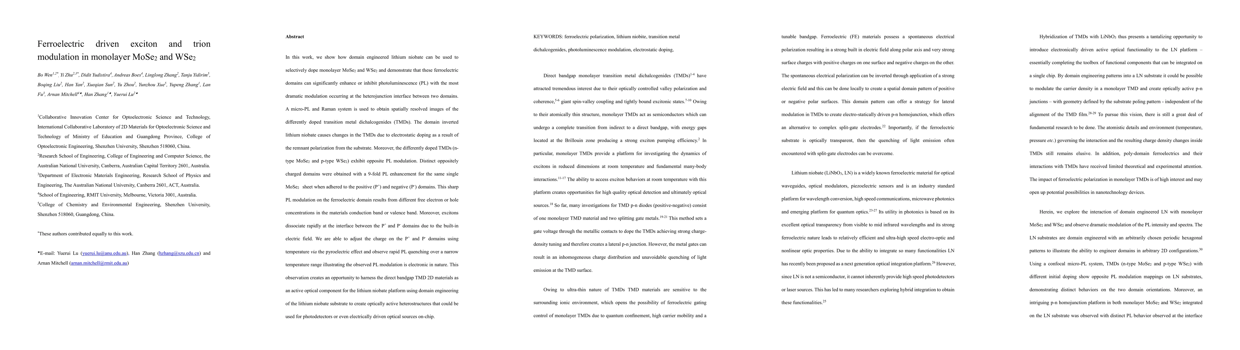 In this work, we show how domain engineered lithium niobate can be used to selectively dope monolayer MoSe2 and WSe2 and demonstrate that these ferroelectric domains can significantly enhance or inhibit photoluminescence (PL) with the most dramatic modulation occurring at the heterojunction interface between two domains. A micro-PL and Raman system is used to obtain spatially resolved images of the differently doped transition metal dichalcogenides (TMDs). The domain inverted lithium niobate causes changes in the TMDs due to electrostatic doping as a result of the remnant polarization from the substrate. Moreover, the differently doped TMDs (n-type MoSe2 and p-type WSe2) exhibit opposite PL modulation. Distinct oppositely charged domains were obtained with a 9-fold PL enhancement for the same single MoSe2 sheet when adhered to the positive (P+) and negative (P-) domains. This sharp PL modulation on the ferroelectric domain results from different free electron or hole concentrations in the materials conduction band or valence band. Moreover, excitons dissociate rapidly at the interface between the P+ and P- domains due to the built-in electric field. We are able to adjust the charge on the P+ and P- domains using temperature via the pyroelectric effect and observe rapid PL quenching over a narrow temperature range illustrating the observed PL modulation is electronic in nature. This observation creates an opportunity to harness the direct bandgap TMD 2D materials as an active optical component for the lithium niobate platform using domain engineering of the lithium niobate substrate to create optically active heterostructures that could be used for photodetectors or even electrically driven optical sources on-chip.