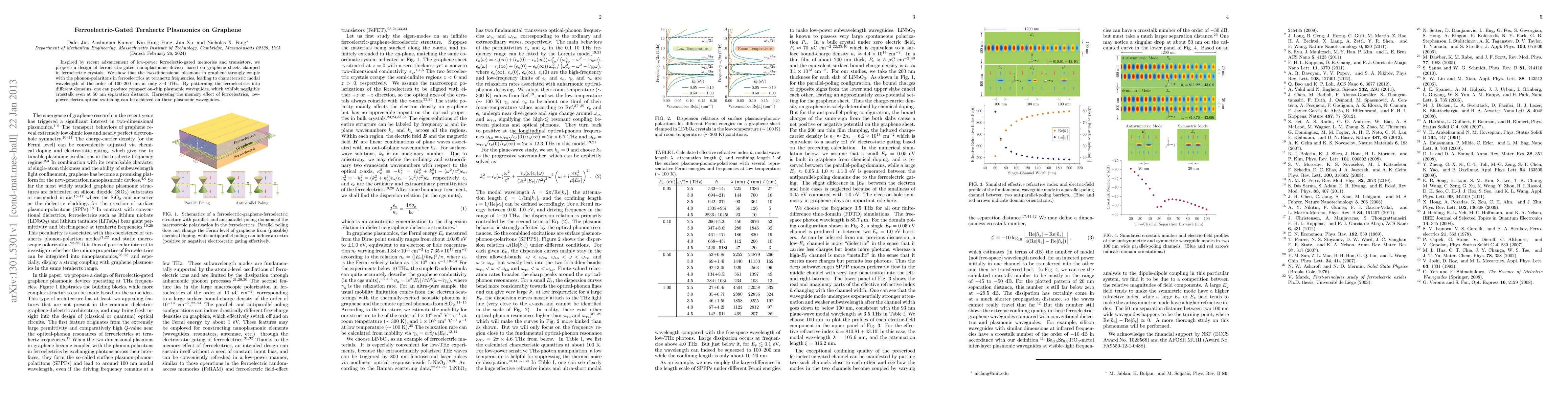 This paper proposes ferroelectric-gated terahertz plasmonic devices on graphene, demonstrating strong coupling between graphene plasmons and ferroelectric phonon-polaritons, resulting in compact waveguides with negligible crosstalk and low-power electro-optical switching.