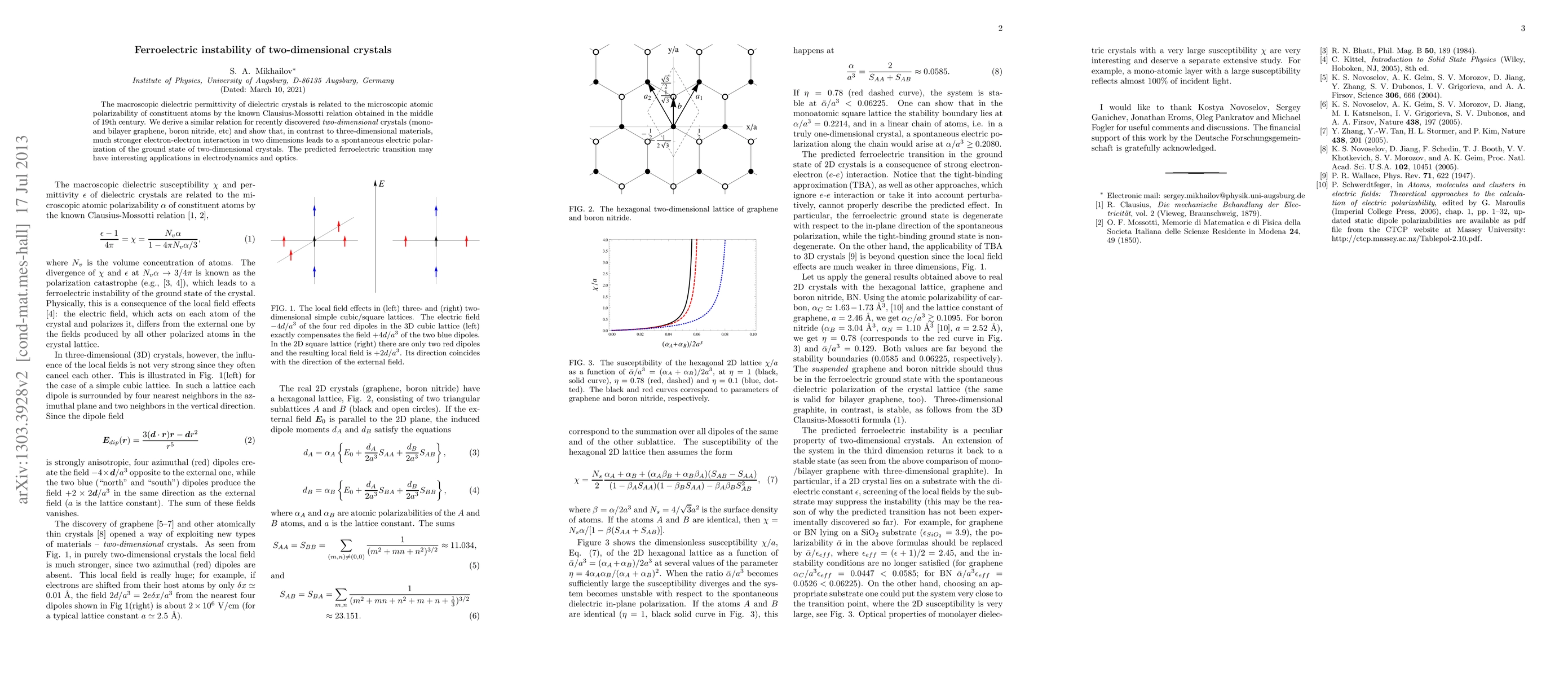 The macroscopic dielectric permittivity of dielectric crystals is related to the microscopic atomic polarizability of constituent atoms by the known Clausius-Mossotti relation obtained in the middle of 19th century. We derive a similar relation for recently discovered two-dimensional crystals (mono- and bilayer graphene, boron nitride, etc) and show that, in contrast to three-dimensional materials, much stronger electron-electron interaction in two dimensions leads to a spontaneous electric polarization of the ground state of two-dimensional crystals. The predicted ferroelectric transition may have interesting applications in electrodynamics and optics.
