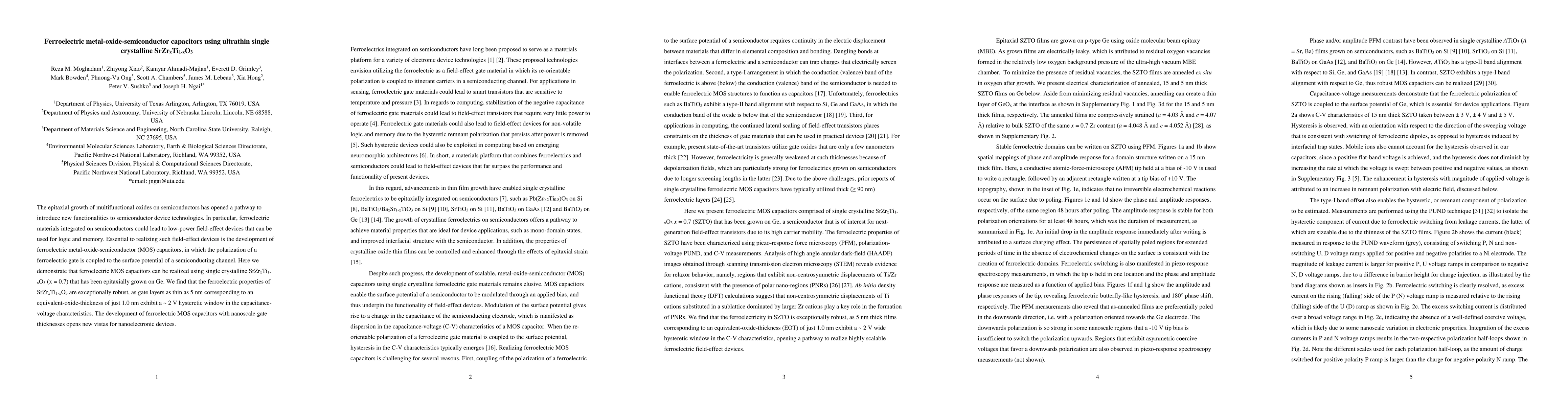 This study demonstrates the epitaxial growth of ferroelectric SrZrxTi1-xO3 (x = 0.7) on Ge to create robust ferroelectric metal-oxide-semiconductor capacitors with a 5 nm gate layer, showing a 2 V hysteretic window, paving the way for low-power nanoelectronic devices.