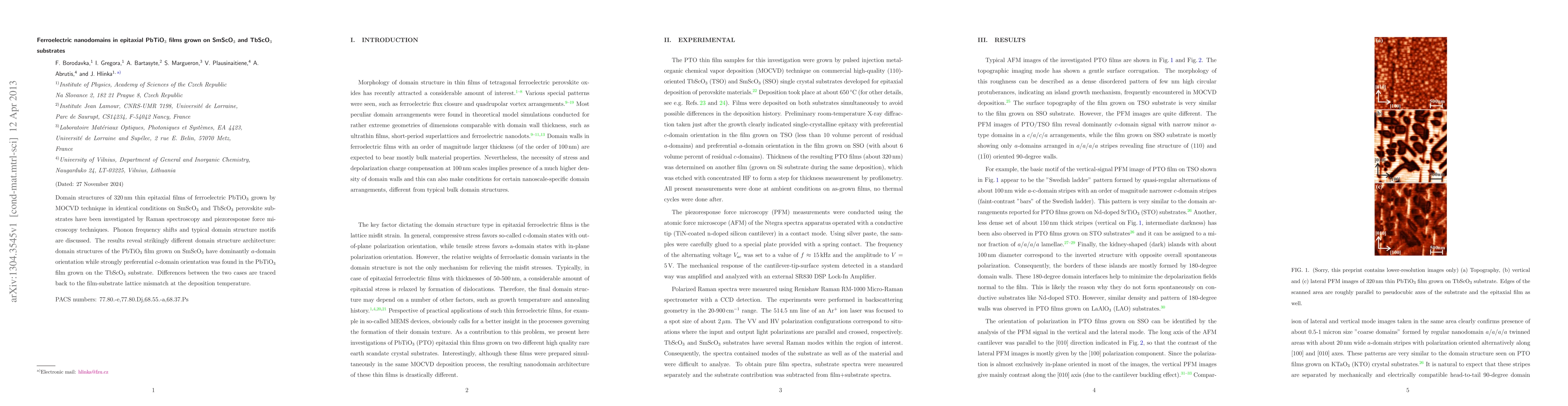 Domain structures of 320 nm thin epitaxial films of ferroelectric PbTiO3 grown by MOCVD technique in identical conditions on SmScO3 and TbScO3 perovskite sub- strates have been investigated by Raman spectroscopy and piezoresponse force microscopy techniques. Phonon frequency shifts and typical domain structure motifs are discussed. The results reveal strikingly different domain structure architecture: domain structures of the PbTiO3 film grown on SmScO3 have dominantly a-domain orientation while strongly preferential c-domain orientation was found in the PbTiO3 film grown on the TbScO3 substrate. Differences between the two cases are traced back to the film-substrate lattice mismatch at the deposition temperature.