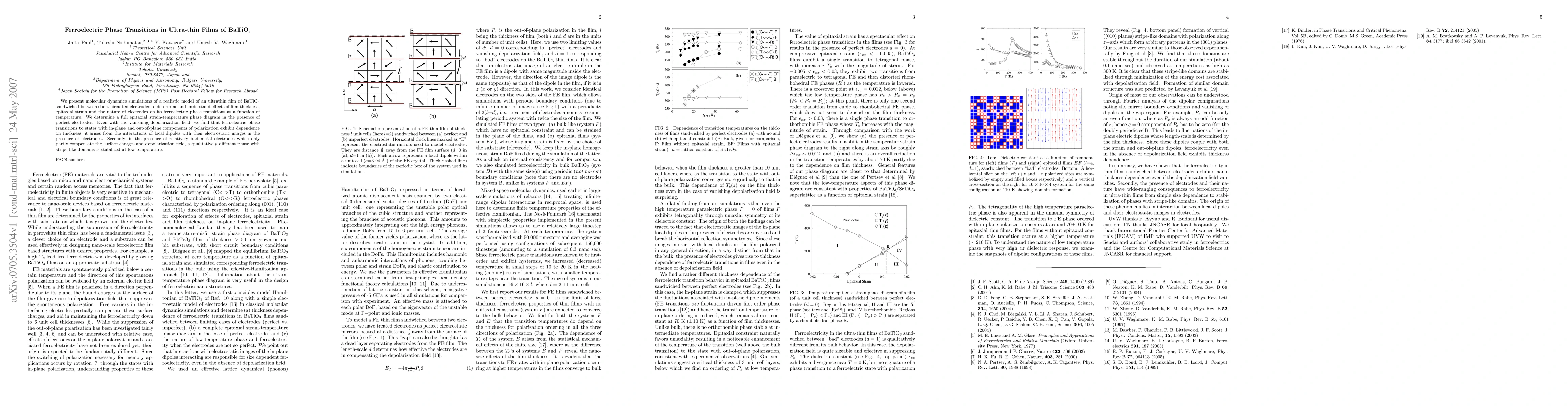 This study uses molecular dynamics simulations to explore ferroelectric phase transitions in ultra-thin BaTiO$_3$ films under various conditions, revealing that film thickness and electrode properties significantly influence these transitions, including the stabilization of stripe-like domains in imperfect metal electrodes.