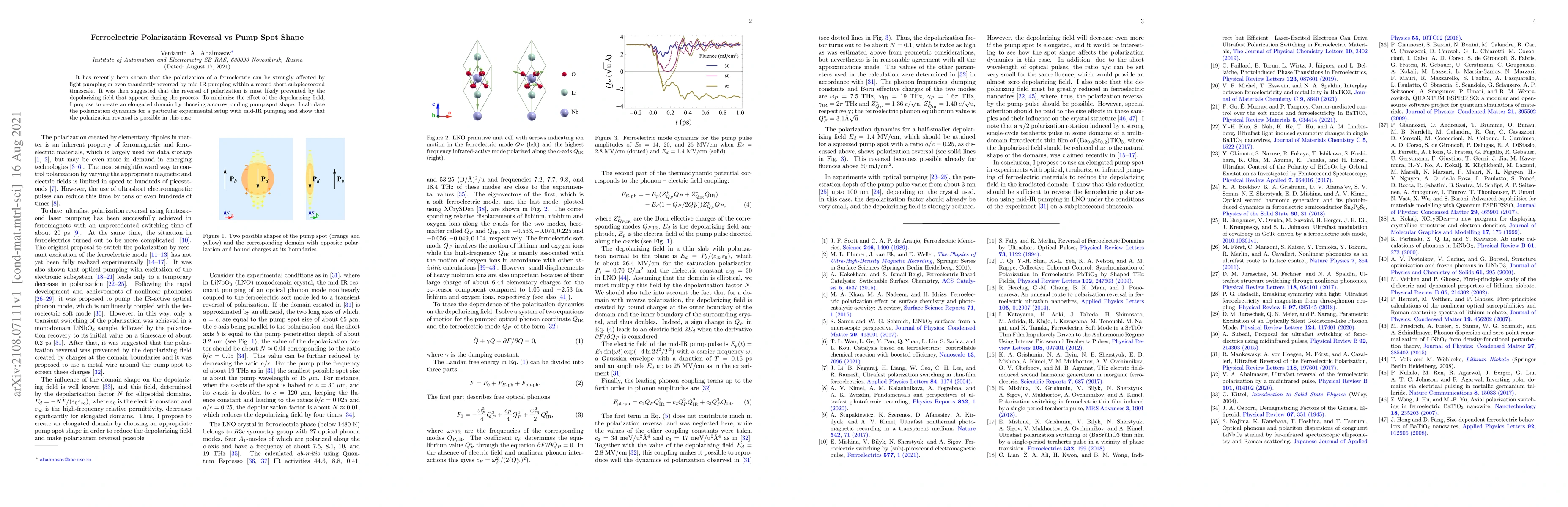 It has recently been shown that the polarization of a ferroelectric can be strongly affected by light pumping or even transiently reversed by mid-IR pumping within a record short subpicosecond timescale. It was then suggested that the reversal of polarization is most likely prevented by the depolarizing field that appears during the process. To minimize the effect of the depolarizing field, I propose to create an elongated domain by choosing a corresponding pump spot shape. I calculate the polarization dynamics for a particular experimental setup with mid-IR pumping and show that the polarization reversal is possible in this case.