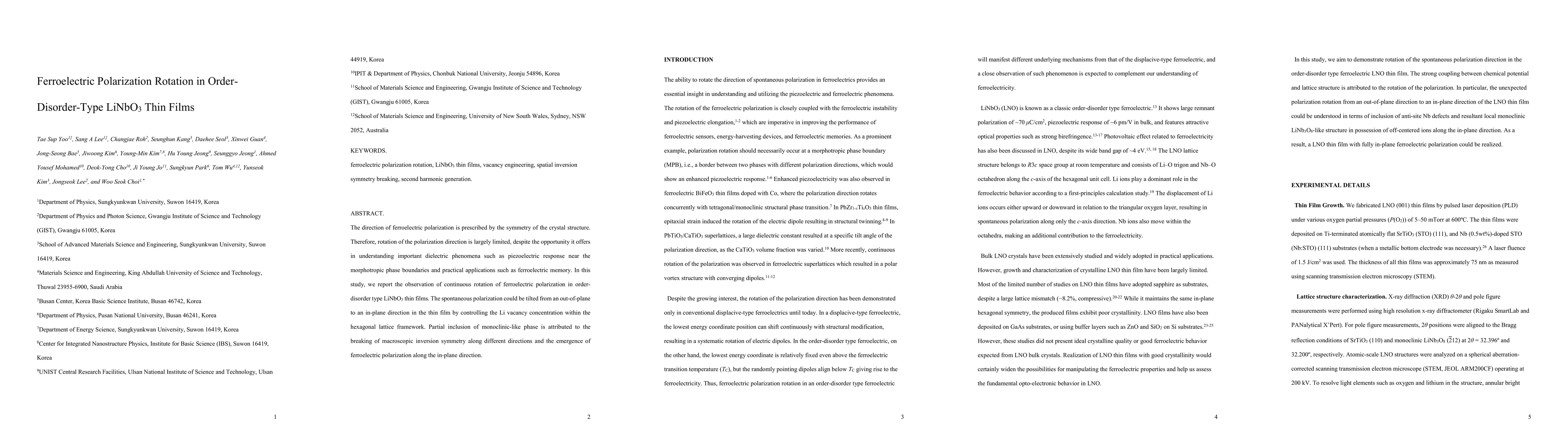 This study observes continuous ferroelectric polarization rotation in order-disorder type LiNbO3 thin films, enabling the spontaneous polarization to shift from out-of-plane to in-plane by adjusting Li vacancy concentration, which breaks macroscopic inversion symmetry and introduces a monoclinic-like phase.