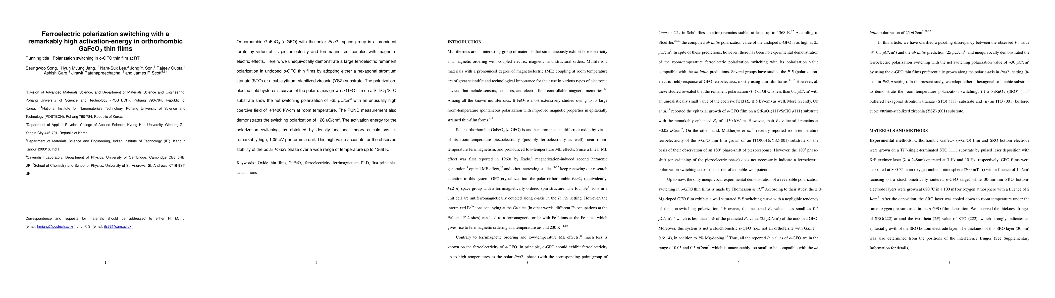 This study demonstrates large ferroelectric remanent polarization in undoped orthorhombic GaFeO3 thin films on SrTiO3/STO substrates, showing a net switching polarization of ~35 μC/cm² and a high coercive field of ±1400 kV/cm at room temperature. The remarkably high activation energy of 1.05 eV per formula unit explains the stability of the polar Pna21 phase.