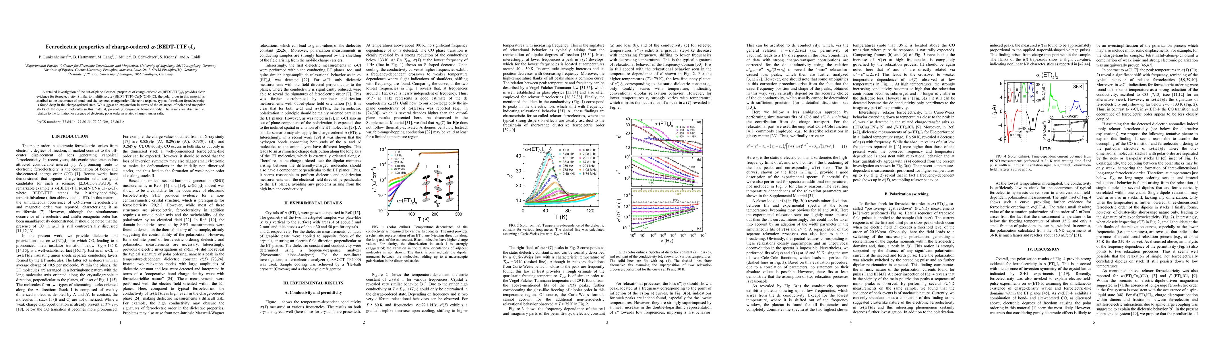 This study reveals ferroelectric properties in charge-ordered alpha-(BEDT-TTF)2I3, attributed to bond- and site-centered charge order, with a dielectric response characteristic of relaxor ferroelectricity due to polar and nonpolar molecular stacks. The findings are compared with related charge-transfer salts to understand electronic polar order.