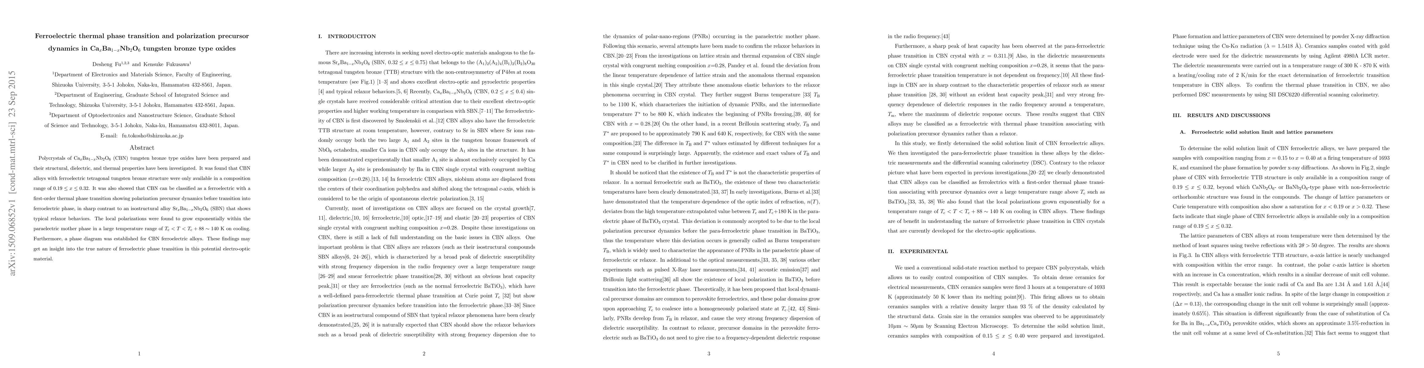 Polycrystals of CaxBa1-xNb2O6(CBN) tungsten bronze type oxides were prepared, and their structural, dielectric, and thermal properties were investigated.