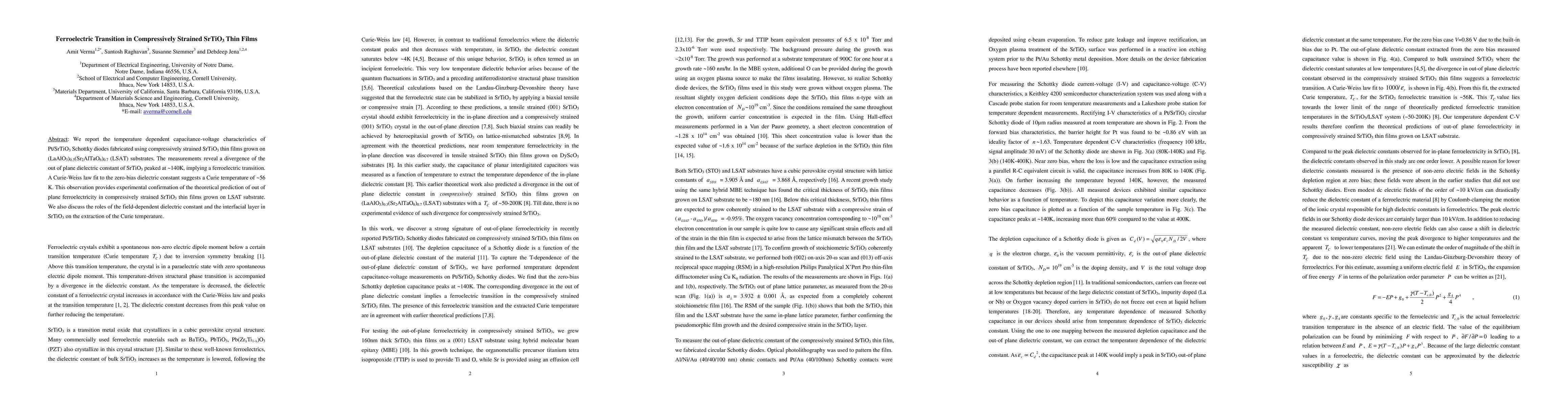 This research investigates the ferroelectric transition in compressively strained SrTiO3 thin films grown on LSAT substrates, revealing a peak in the out-of-plane dielectric constant at ~140K, indicating a ferroelectric transition, with a Curie temperature of ~56K determined by a Curie-Weiss law fit. The study confirms theoretical predictions of ferroelectricity in such strained films.