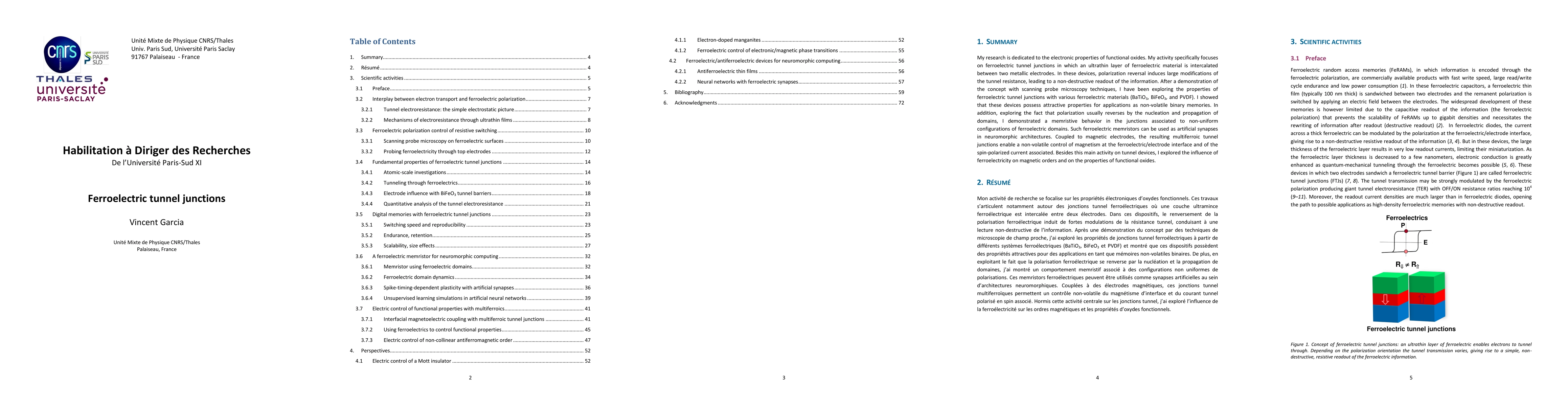 My research is dedicated to the electronic properties of functional oxides. My activity specifically focuses on ferroelectric tunnel junctions in which an ultrathin layer of ferroelectric material is intercalated between two metallic electrodes. In these devices, polarization reversal induces large modifications of the tunnel resistance, leading to a non-destructive readout of the information. After a demonstration of the concept with scanning probe microscopy techniques, I have been exploring the properties of ferroelectric tunnel junctions with various ferroelectric materials (BaTiO3, BiFeO3, and PVDF). I showed that these devices possess attractive properties for applications as non-volatile binary memories. In addition, exploring the fact that polarization usually reverses by the nucleation and propagation of domains, I demonstrated a memristive behavior in the junctions associated to non-uniform configurations of ferroelectric domains. Such ferroelectric memristors can be used as artificial synapses in neuromorphic architectures. Coupled to magnetic electrodes, the resulting multiferroic tunnel junctions enable a non-volatile control of magnetism at the ferroelectric/electrode interface and of the spin-polarized current associated. Besides this main activity on tunnel devices, I explored the influence of ferroelectricity on magnetic orders and on the properties of functional oxides.
