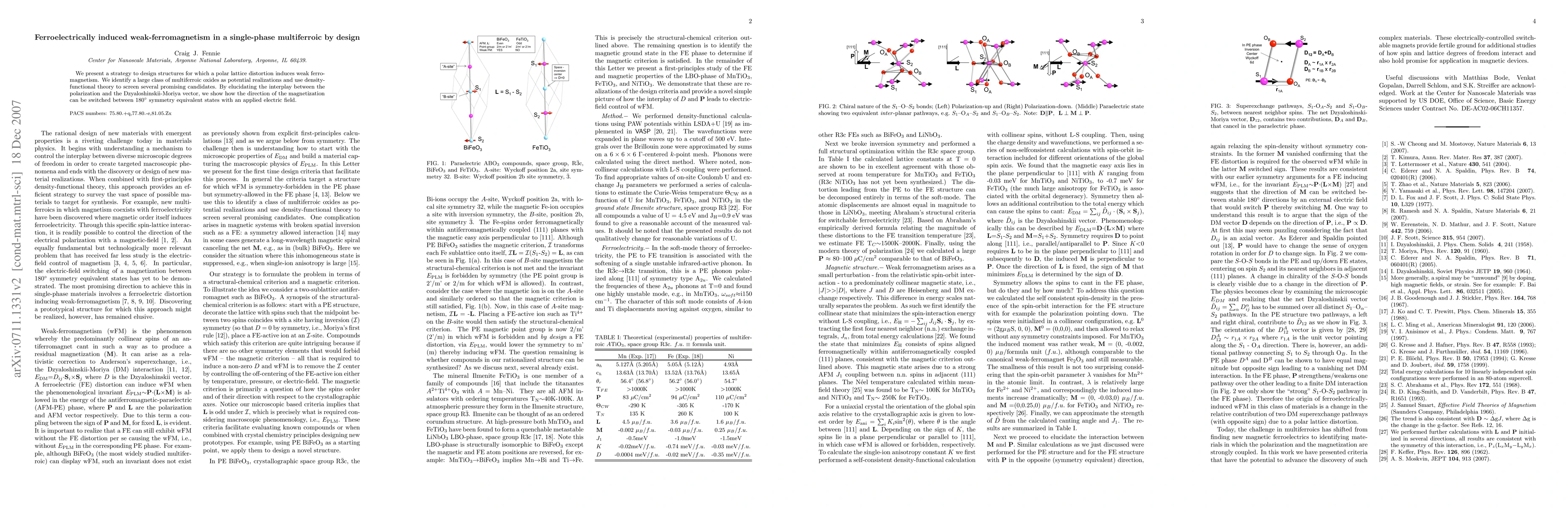 We present a strategy to design structures for which a polar lattice distortion induces weak ferromagnetism. We identify a large class of multiferroic oxides as potential realizations and use density-functional theory to screen several promising candidates. By elucidating the interplay between the polarization and the Dzyaloshinskii-Moriya vector, we show how the direction of the magnetization can be switched between 180$^{\circ}$ symmetry equivalent states with an applied electric field.