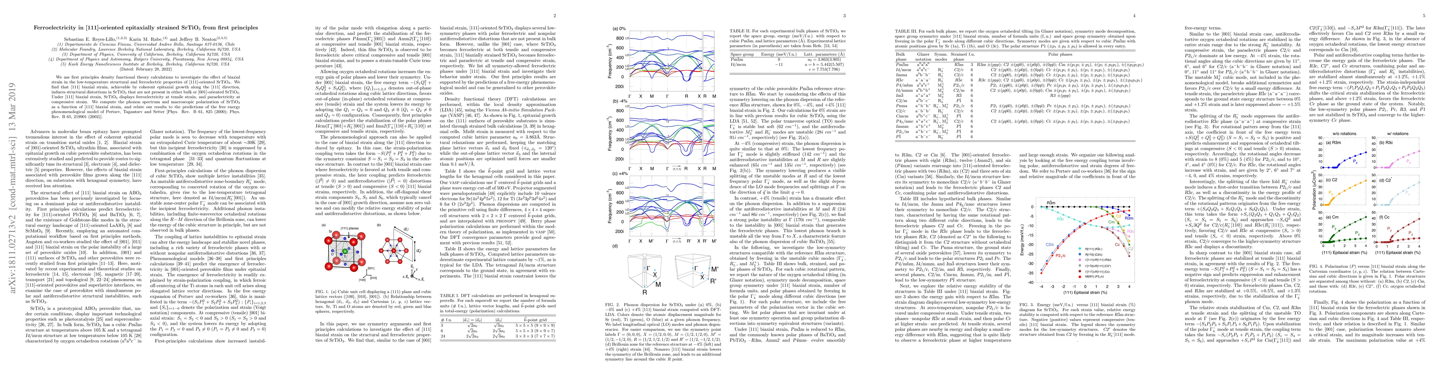 This study employs first principles density functional theory to demonstrate that [111]-oriented SrTiO$_3$ under biaxial strain exhibits ferroelectricity at tensile strain and paraelectricity at compressive strain, revealing structural distortions not seen in bulk or [001]-oriented SrTiO$_3$. The findings align with the free energy phenomenological model predictions.