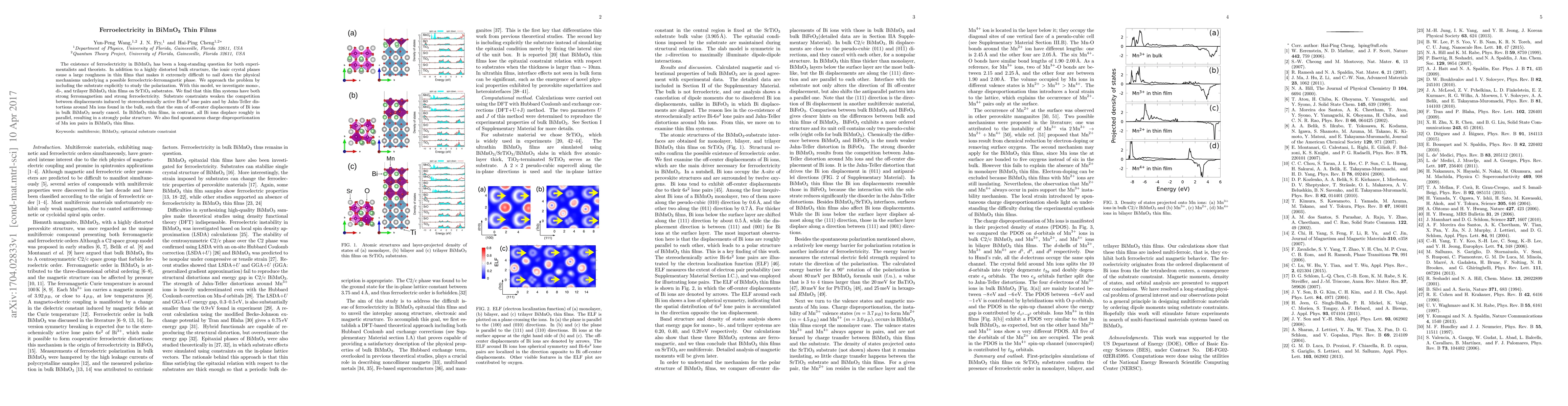 The study reveals ferroelectricity in $\mathrm{BiMnO}_3$ thin films due to substrate-induced alignment of Bi ions, overcoming bulk phase competition, and shows strong ferromagnetism alongside spontaneous charge disproportionation of Mn ions.