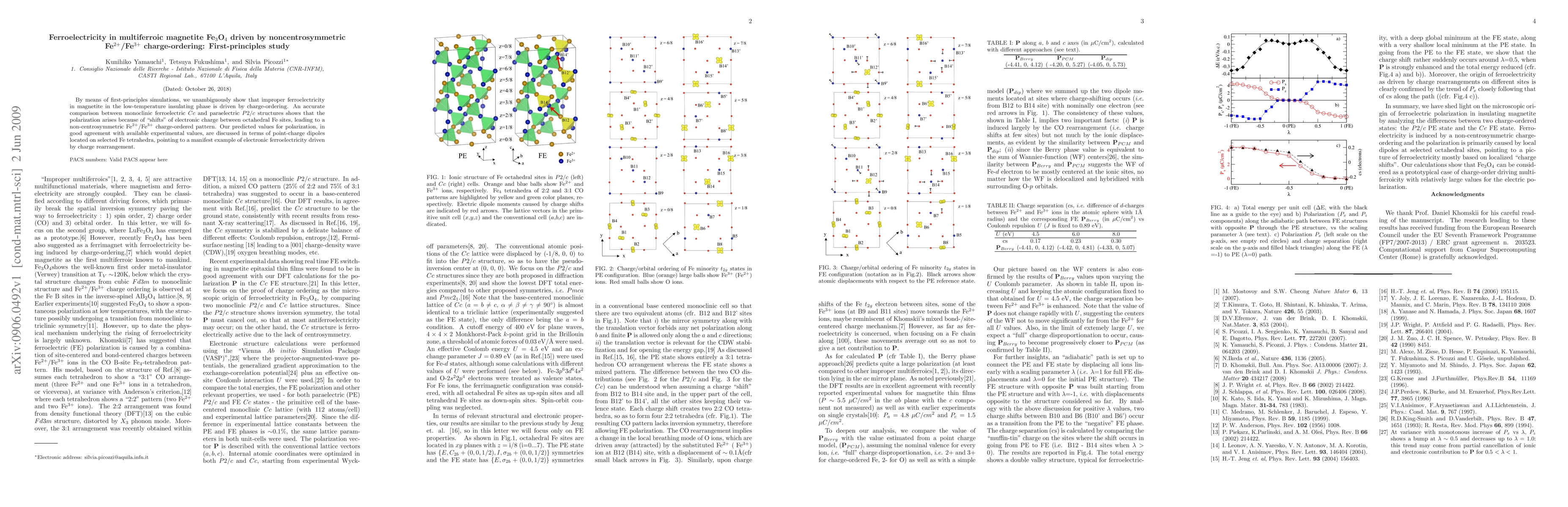 This study reveals that ferroelectricity in magnetite Fe3O4 is driven by noncentrosymmetric Fe2+/Fe3+ charge-ordering, as demonstrated through first-principles simulations. The polarization arises from charge shifts between Fe sites, leading to a charge-ordered pattern, and aligns well with experimental values.
