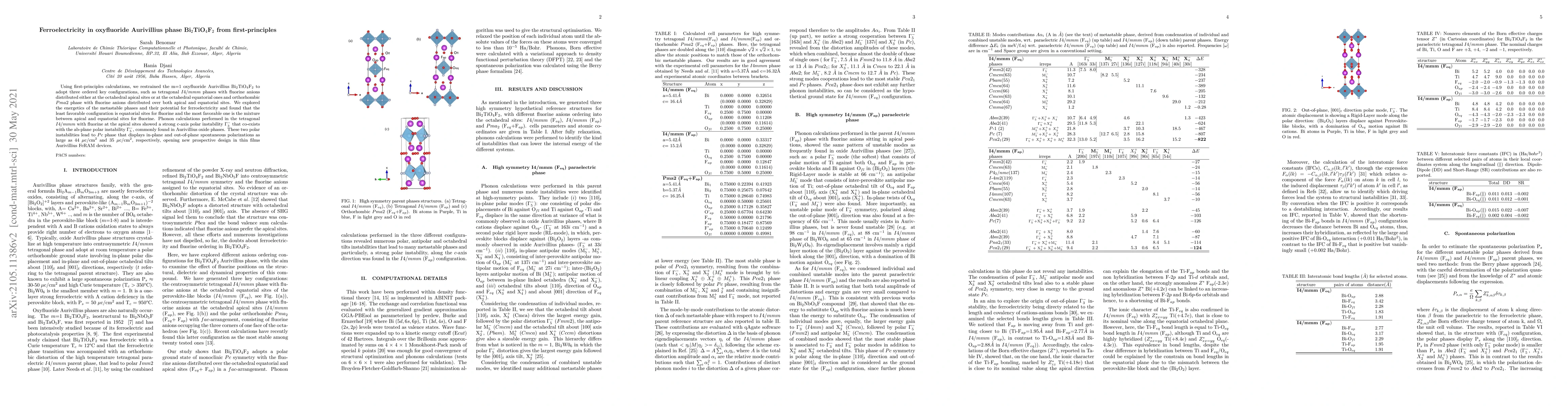 First-principle calculations reveal that Bi$_2$TiO$_4$F$_2$ exhibits ferroelectricity with a tetragonal I4/mmm phase having fluorine at apical sites, displaying large in-plane and out-of-plane polarizations. This suggests potential for designing new Aurivillius FeRAM thin-film devices.