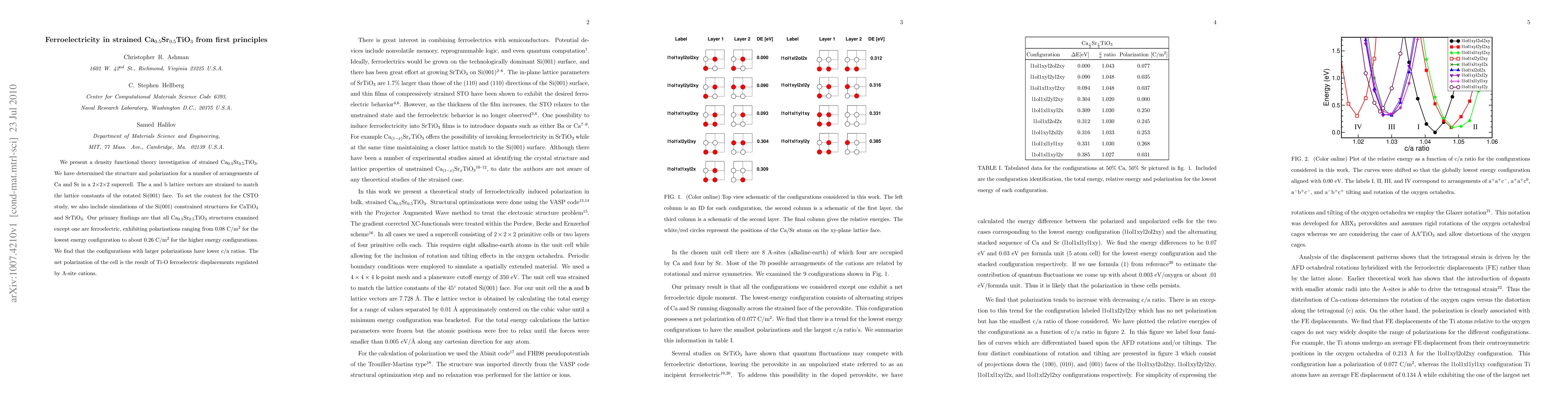 We present a density functional theory investigation of strained Ca$_{0.5}$Sr$_{0.5}$TiO$_3$. We have determined the structure and polarization for a number of arrangements of Ca and Sr in a 2$\times$2$\times$2 supercell. The a and b lattice vectors are strained to match the lattice constants of the rotated Si(001) face. To set the context for the CSTO study, we also include simulations of the Si(001) constrained structures for CaTiO$_3$ and SrTiO$_3$. Our primary findings are that all Ca$_{0.5}$Sr$_{0.5}$TiO$_3$ structures examined except one are ferroelectric, exhibiting polarizations ranging from 0.08 C/m$^2$ for the lowest energy configuration to about 0.26 C/m$^2$ for the higher energy configurations. We find that the configurations with larger polarizations have lower c/a ratios. The net polarization of the cell is the result of Ti-O ferroelectric displacements regulated by A-site cations.
