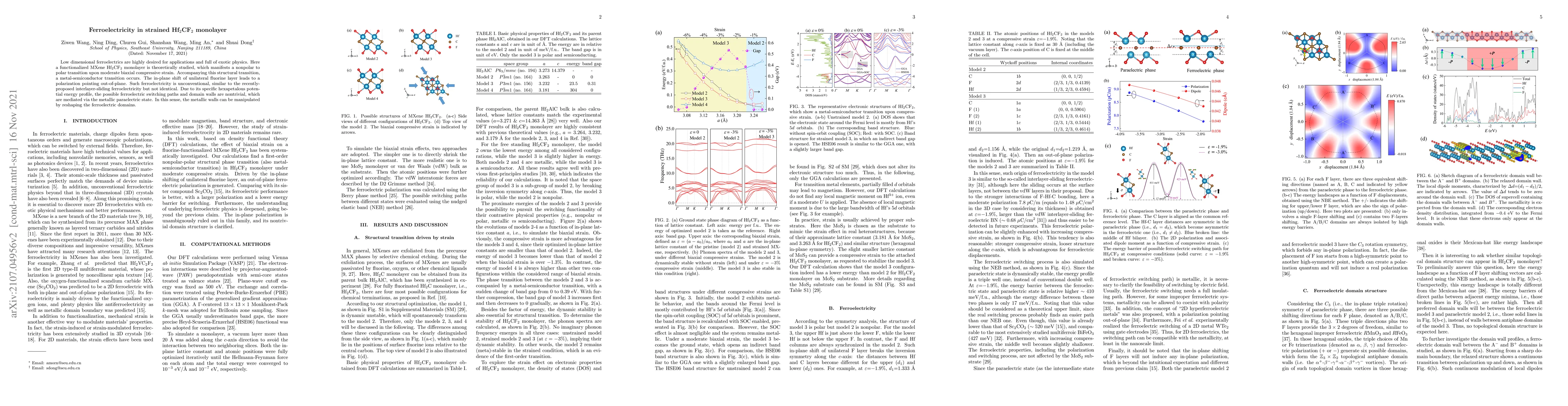 Low dimensional ferroelectrics are highly desired for applications and full of exotic physics. Here a functionalized MXene Hf$_2$CF$_2$ monolayer is theoretically studied, which manifests a nonpolar to polar transition upon moderate biaxial compressive strain. Accompanying this structural transition, a metal-semiconductor transition occurs. The in-plane shift of unilateral fluorine layer leads to a polarization pointing out-of-plane. Such ferroelectricity is unconventional, similar to the recently-proposed interlayer-sliding ferroelectricity but not identical. Due to its specific hexapetalous potential energy profile, the possible ferroelectric switching paths and domain walls are nontrivial, which are mediated via the metallic paraelectric state. In this sense, the metallic walls can be manipulated by reshaping the ferroelectric domains.