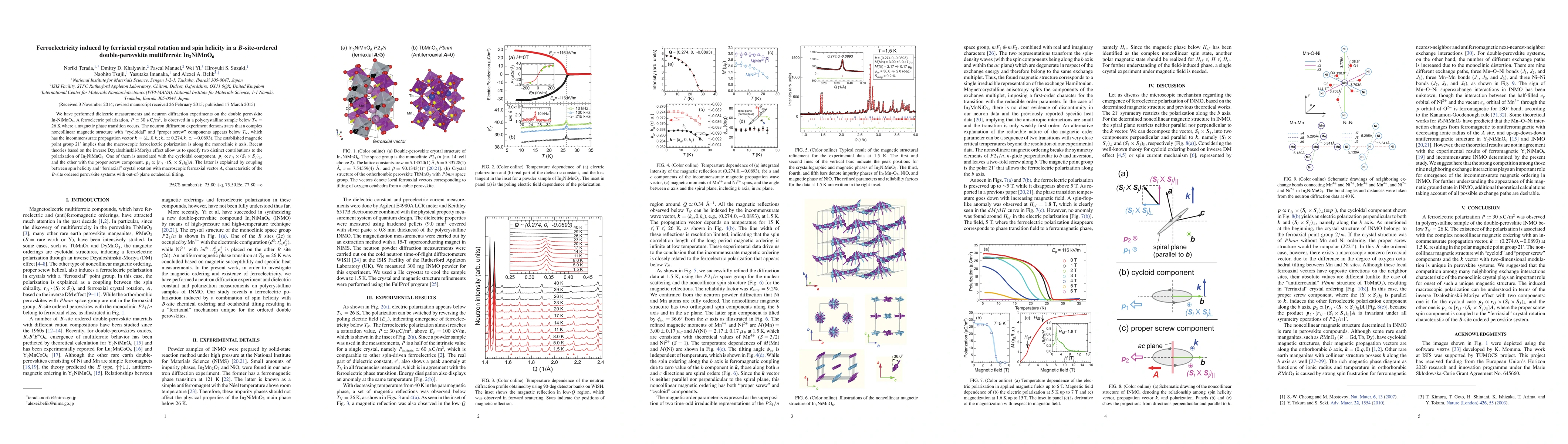 We have performed dielectric measurements and neutron diffraction experiments on the double perovskite In2NiMnO6. A ferroelectric polarization, P ~ 30 {\mu}C/m2, is observed in a polycrystalline sample below TN = 26 K where a magnetic phase ransition occurs. The neutron diffraction experiment demonstrates that a complex noncollinear magnetic structure with "cycloidal" and "proper screw" components appears below TN, which has the incommensurate propagation vector k = (ka,0,ks; ka ~ 0.274, ks ~ -0.0893). The established magnetic point group 21' implies that the macroscopic ferroelectric polarization is along the monoclinic b axis. Recent theories based on the inverse Dzyaloshinskii-Moriya effect allow us to specify two distinct contributions to the polarization of In2NiMnO6. One of them is associated with the cycloidal component, p1 ~ rij x (Si x Sj), and the other with the proper screw component, p2 ~ [rij (Si x Sj )]A. The latter is explained by coupling between spin helicity and "ferriaxial" crystal rotation with macroscopic ferroaxial vector A, characteristic of the B-site ordered perovskite systems with out-of-plane octahedral tilting.