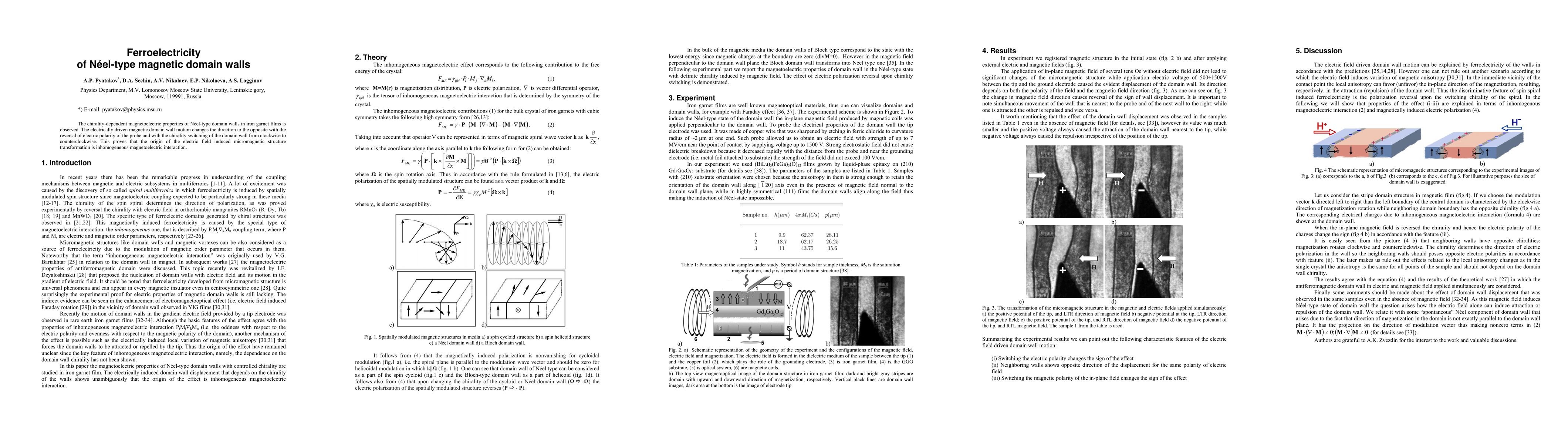 This study investigates the ferroelectric behavior of Neel-type magnetic domain walls in iron garnet films, revealing that electric field-induced transformations depend on the chirality of the domain walls and the polarity of the electric field. The findings suggest an inhomogeneous magnetoelectric interaction as the underlying mechanism.