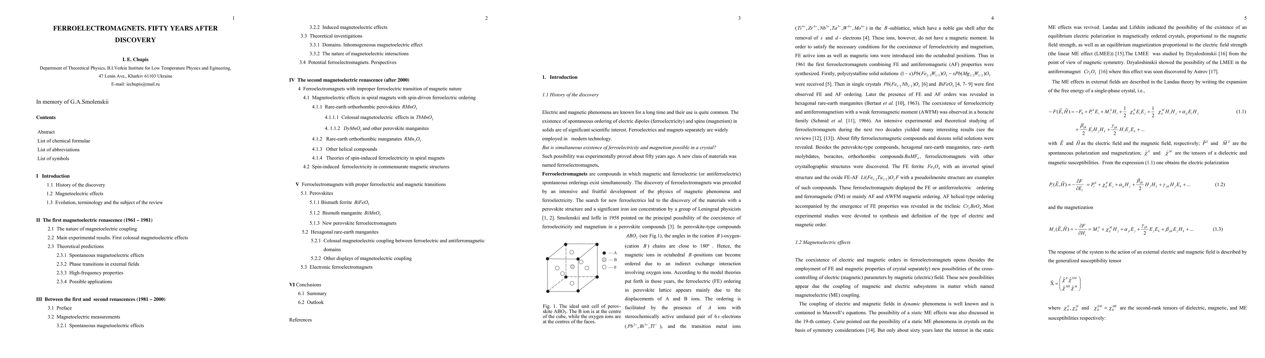 Ferroelectromagnets - compounds with ferroelectric and magnetic orderings - were discovered about fifty years ago. They are of great interest due to the possibility of mutual control of electric (magnetic) properties by magnetic (electric) field. At present such possibility of magnetoelectric control has become reality which stimulated revival of scientific and practical interest in ferroelectromagnets. The progress in experimental and theoretical investigations of magnetoelectric phenomena in ferroelectromagnets for the last years, especially the colossal magnetoelectric effects observed recently, are considered. The problems and future prospects of enhancing magnetoelectric effects in ferroelectromagnets are being discussed. The book is intended for researchers in ferroelectricity and magnetism and for students of physical specialities.