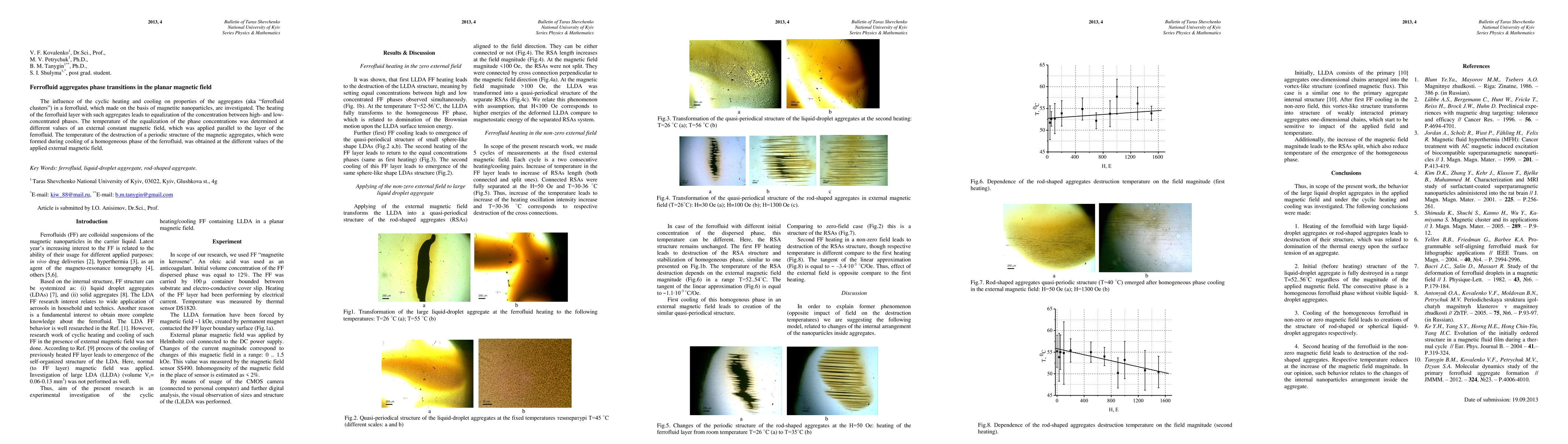 The influence of the cyclic heating and cooling on properties of the aggregates (aka "ferrofluid clusters") in a ferrofluid, which made on the basis of magnetite nanoparticles, are investigated. The heating of the ferrofluid layer with such aggregates leads to equalization of the concentration between high- and low-concentrated phases. The temperature of the equalization of the phase concentrations was determined at different values of an external constant magnetic field, which was applied parallel to the layer of the ferrofluid. The temperature of the destruction of a periodic structure of the magnetic aggregates, which were formed during cooling of a homogeneous phase of the ferrofluid, was obtained at the different values of the applied external magnetic field.