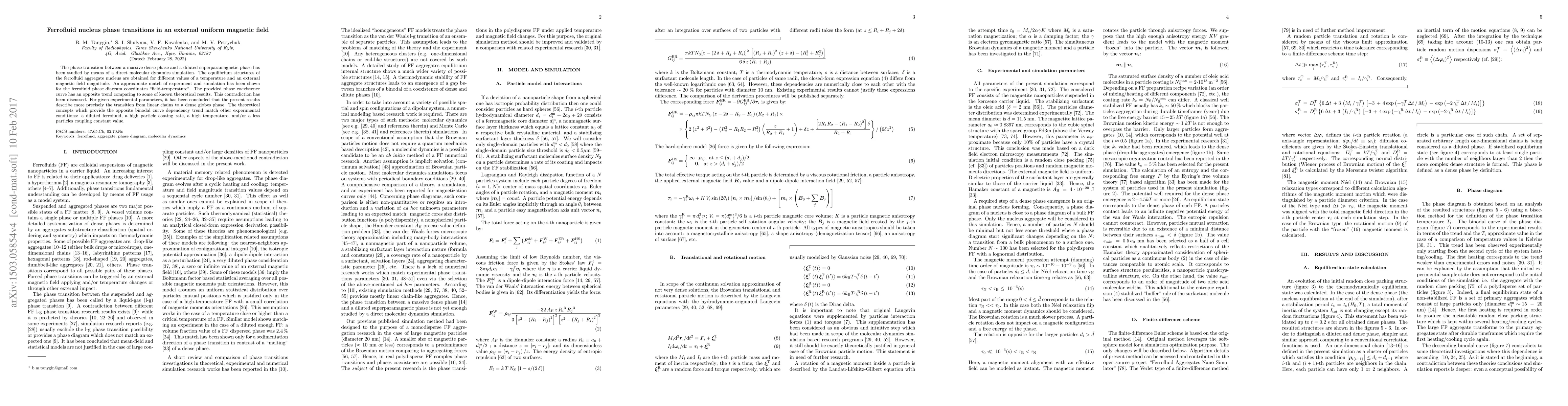 The phase transition between a massive dense phase and a diluted superparamagnetic phase has been studied by means of a direct molecular dynamics simulation. The equilibrium structures of the ferrofluid aggregate nucleus are obtained for different values of a temperature and an external magnetic field magnitude. An approximate match of experiment and simulation has been shown for the ferrofluid phase diagram coordinates "field-temperature". The provided phase coexistence curve has an opposite trend comparing to some of known theoretical results. This contradiction has been discussed. For given experimental parameters, it has been concluded that the present results describe more precisely the transition from linear chains to a dense globes phase. The theoretical concepts which provide the opposite binodal curve dependency trend match other experimental conditions: a diluted ferrofluid, a high particle coating rate, a high temperature, and/or a less particles coupling constant value.
