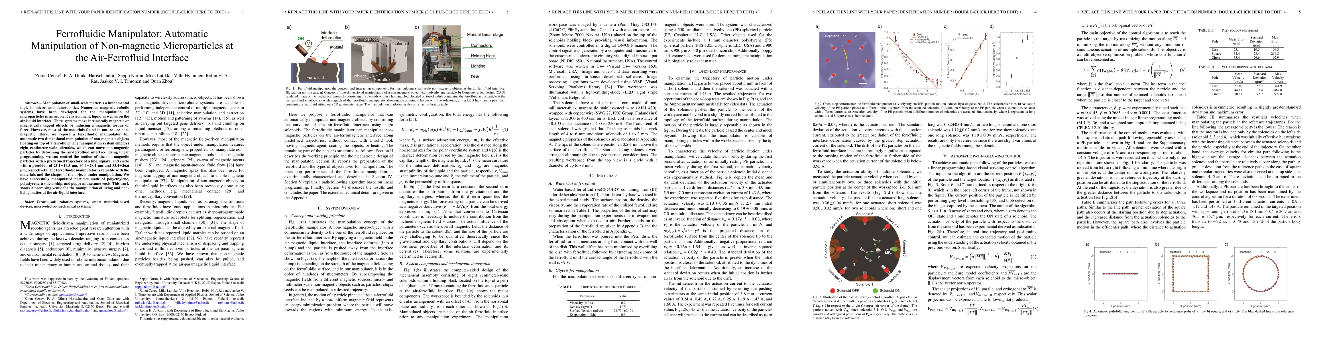 This paper presents a ferrofluidic manipulator that automatically moves non-magnetic microparticles at the air-ferrofluid interface using centimeter-scale solenoids to deform the interface. The system can precisely control particle trajectories, demonstrating versatility in manipulating various non-magnetic materials.