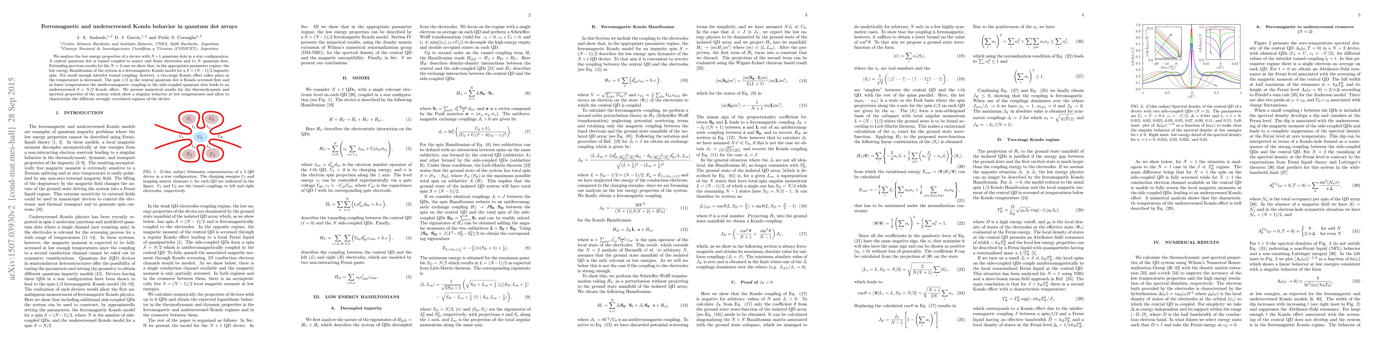 We analyze the low energy properties of a device with $N+1$ quantum dots in a star configuration. A central quantum dot is tunnel coupled to source and drain electrodes and to $N$ quantum dots. Extending previous results for the $N=2$ case we show that, in the appropriate parameter regime, the low energy Hamiltonian of the system is a ferromagnetic Kondo model for a $S=(N-1)/2$ impurity spin. For small enough interdot tunnel coupling, however, a two-stage Kondo effect takes place as the temperature is decreased. The spin $1/2$ in the central quantum dot is Kondo screened first and at lower temperatures the antiferromagnetic coupling to the side coupled quantum dots leads to an underscreened $S=N/2$ Kondo effect. We present numerical results for the thermodynamic and spectral properties of the system which show a singular behavior at low temperatures and allow to characterize the different strongly correlated regimes of the device.