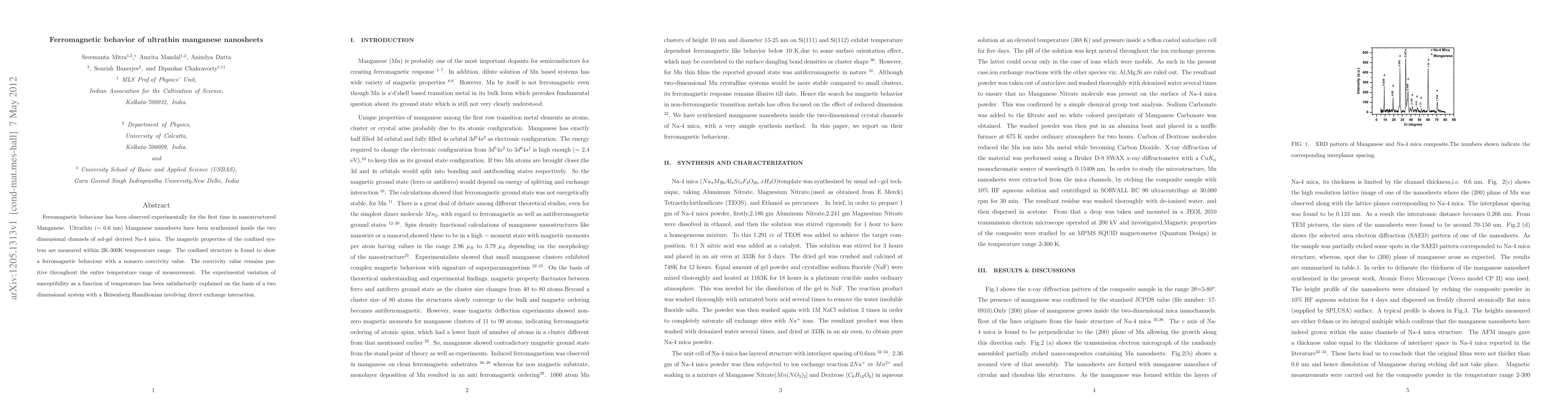 Ultrathin manganese nanosheets ($\sim$ 0.6 nm) exhibit ferromagnetic behavior for the first time, synthesized within the channels of sol-gel derived Na-4 mica, showing a nonzero coercivity across a 2K-300K temperature range, explained by a two-dimensional Heisenberg model.