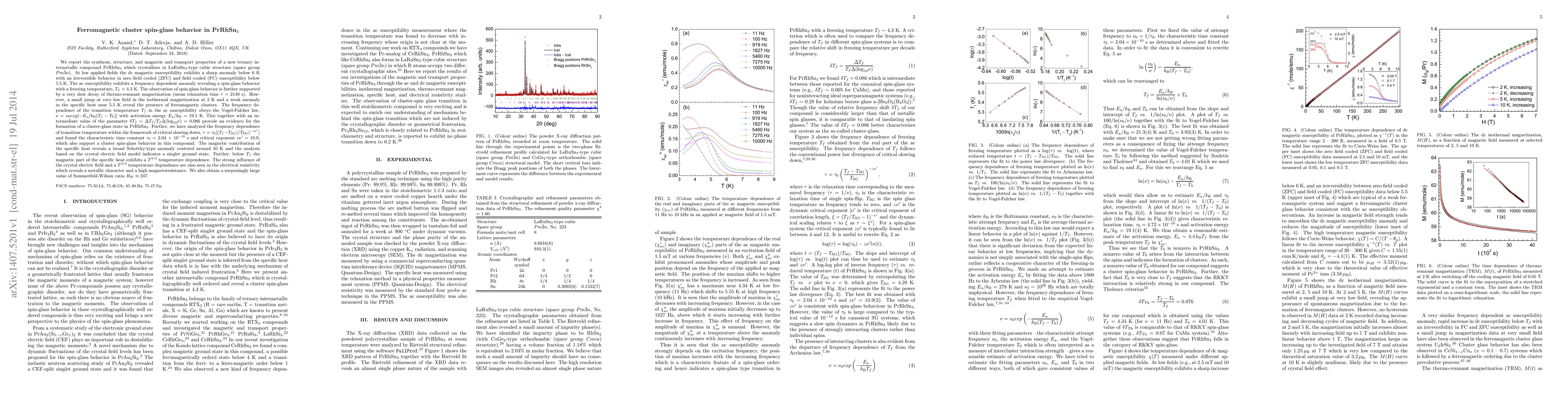 The research paper reports the discovery of a new intermetallic compound PrRhSn3, which exhibits both ferromagnetic cluster and spin-glass behaviors. The compound's unique magnetic and transport properties, such as a cluster-glass state, Vogel-Fulcher law compliance, and high Sommerfeld-Wilson ratio, are analyzed, revealing a singlet ground state and metallic character with high magnetoresistance.