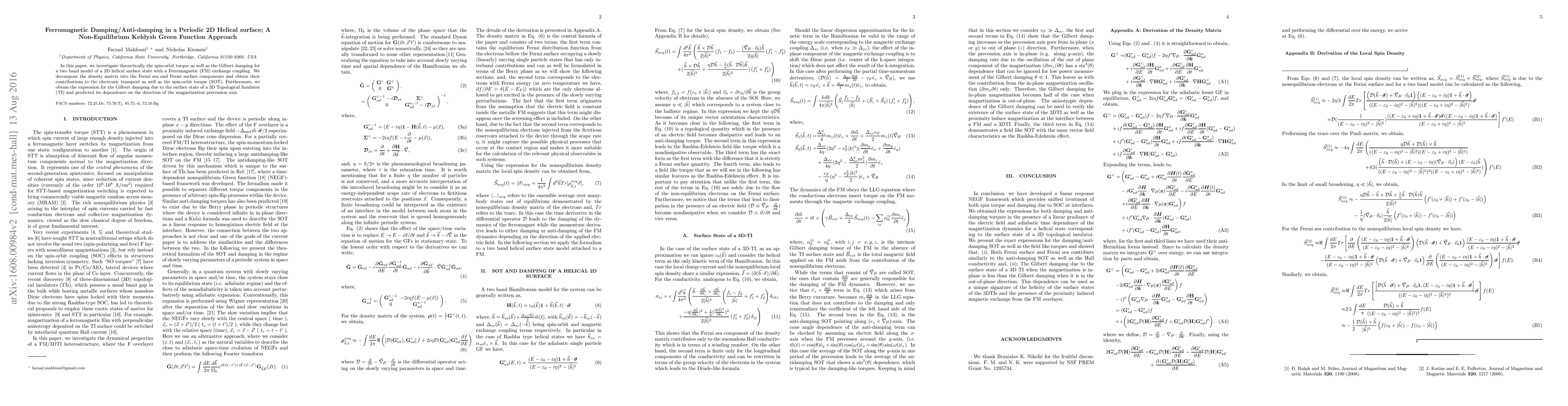 In this paper, we investigate theoretically the spin-orbit torque as well as the Gilbert damping for a two band model of a 2D helical surface state with a Ferromagnetic (FM) exchange coupling. We decompose the density matrix into the Fermi sea and Fermi surface components and obtain their contributions to the electronic transport as well as the spin-orbit torque (SOT). Furthermore, we obtain the expression for the Gilbert damping due to the surface state of a 3D Topological Insulator (TI) and predicted its dependence on the direction of the magnetization precession axis.
