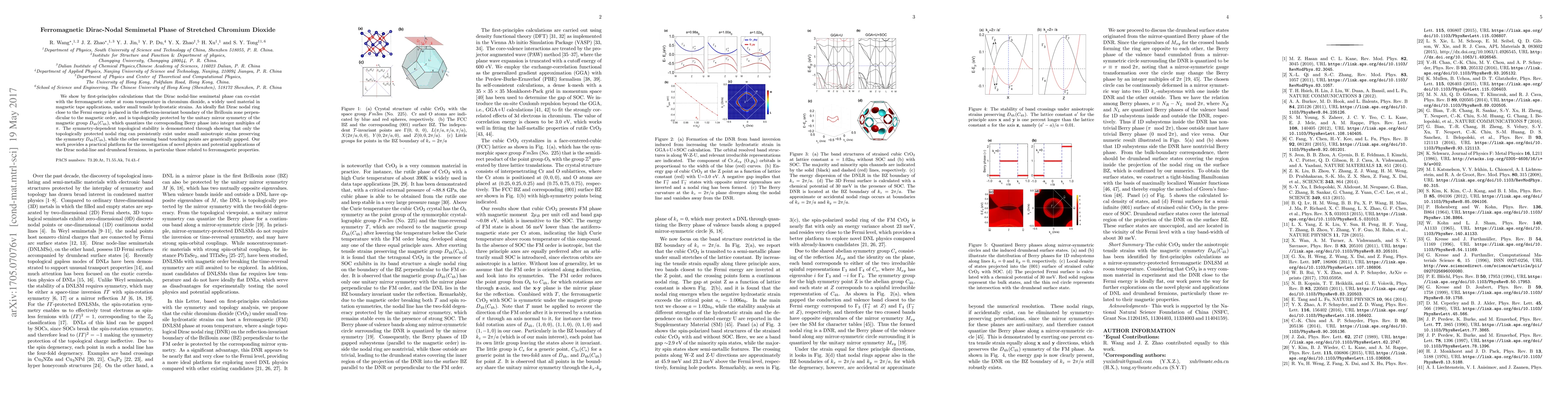 This paper demonstrates, via first-principles calculations, that chromium dioxide can exhibit a ferromagnetic Dirac-nodal semimetal phase at room temperature under tensile strains. The topologically protected Dirac nodal ring, stable under symmetry-preserving strains, suggests potential for novel physics and applications related to ferromagnetic properties.