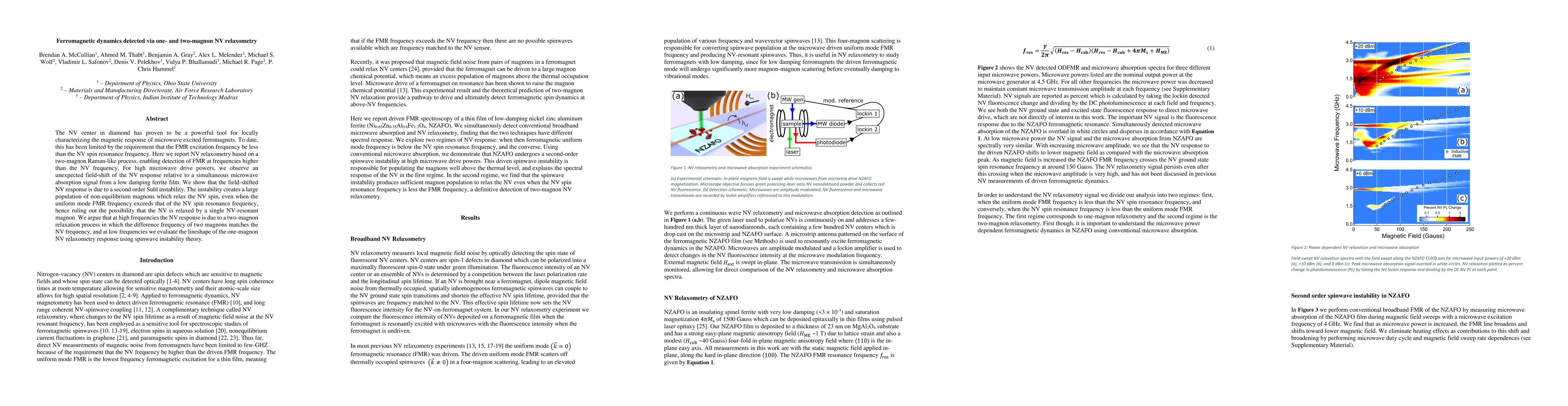 This paper reports on NV center relaxometry in diamond for detecting ferromagnetic dynamics, utilizing a two-magnon Raman-like process to detect ferromagnetic resonance (FMR) at frequencies higher than the NV frequency. It reveals a field-shifted NV response due to a second-order Suhl instability, indicating a two-magnon relaxation process at high frequencies.