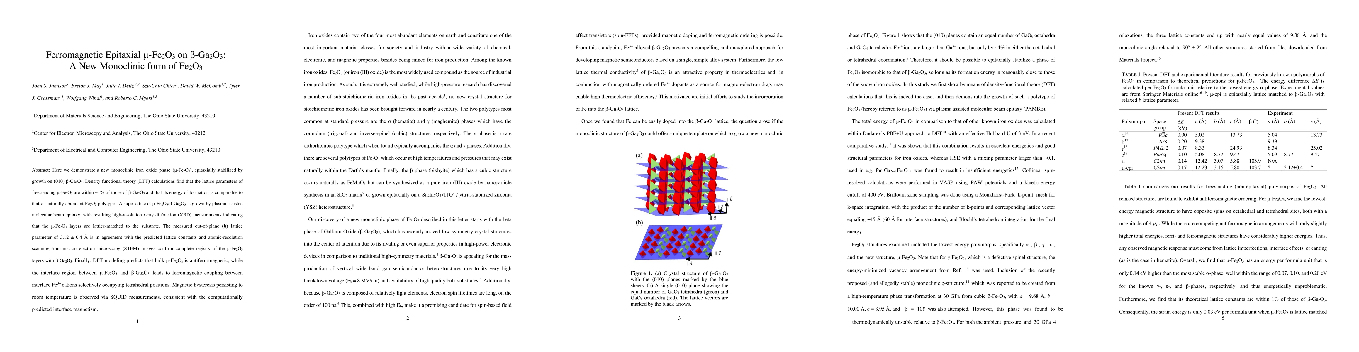This paper demonstrates the epitaxial growth of a new monoclinic iron oxide phase, μ-Fe₂O₃, on β-Ga₂O₃, revealing ferromagnetic coupling at the interface due to selective occupation of tetrahedral positions by Fe³⁺ cations, confirmed by high-resolution XRD and STEM, and observed via SQUID measurements.