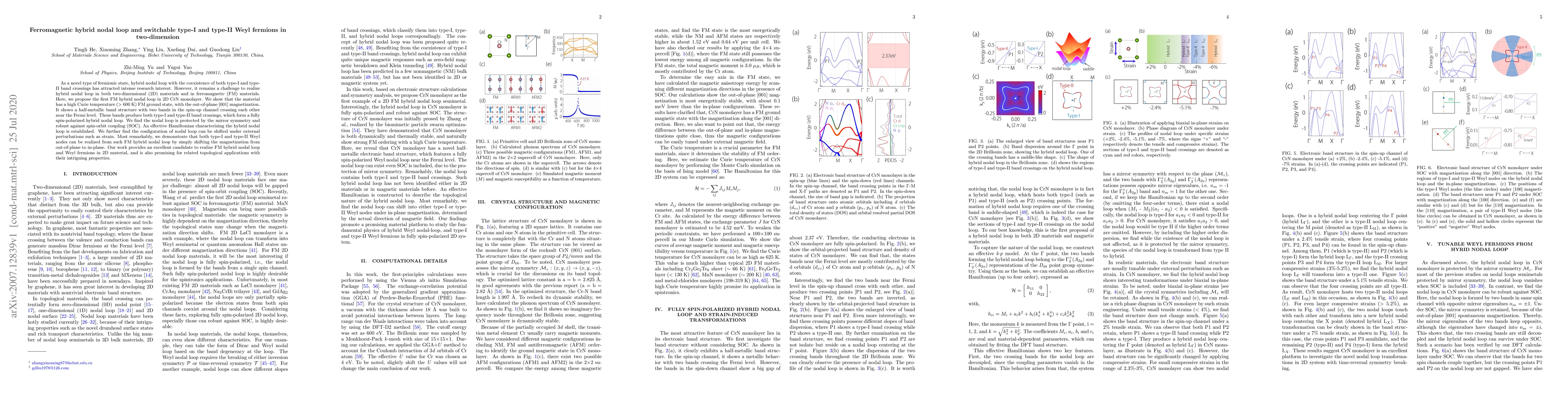 As a novel type of fermionic state, hybrid nodal loop with the coexistence of both type-I and type- II band crossings has attracted intense research interest. However, it remains a challenge to realize hybrid nodal loop in both two-dimensional (2D) materials and in ferromagnetic (FM) materials. Here, we propose the first FM hybrid nodal loop in 2D CrN monolayer. We show that the material has a high Curie temperature (> 600 K) FM ground state, with the out-of-plane [001] magnetization. It shows a half-metallic band structure with two bands in the spin-up channel crossing each other near the Fermi level. These bands produce both type-I and type-II band crossings, which form a fully spin-polarized hybrid nodal loop. We find the nodal loop is protected by the mirror symmetry and robust against spin-orbit coupling (SOC). An effective Hamiltonian characterizing the hybrid nodal loop is established. We further find the configuration of nodal loop can be shifted under external perturbations such as strain. Most remarkably, we demonstrate that both type-I and type-II Weyl nodes can be realized from such FM hybrid nodal loop by simply shifting the magnetization from out-of-plane to in-plane. Our work provides an excellent candidate to realize FM hybrid nodal loop and Weyl fermions in 2D material, and is also promising for related topological applications with their intriguing properties.