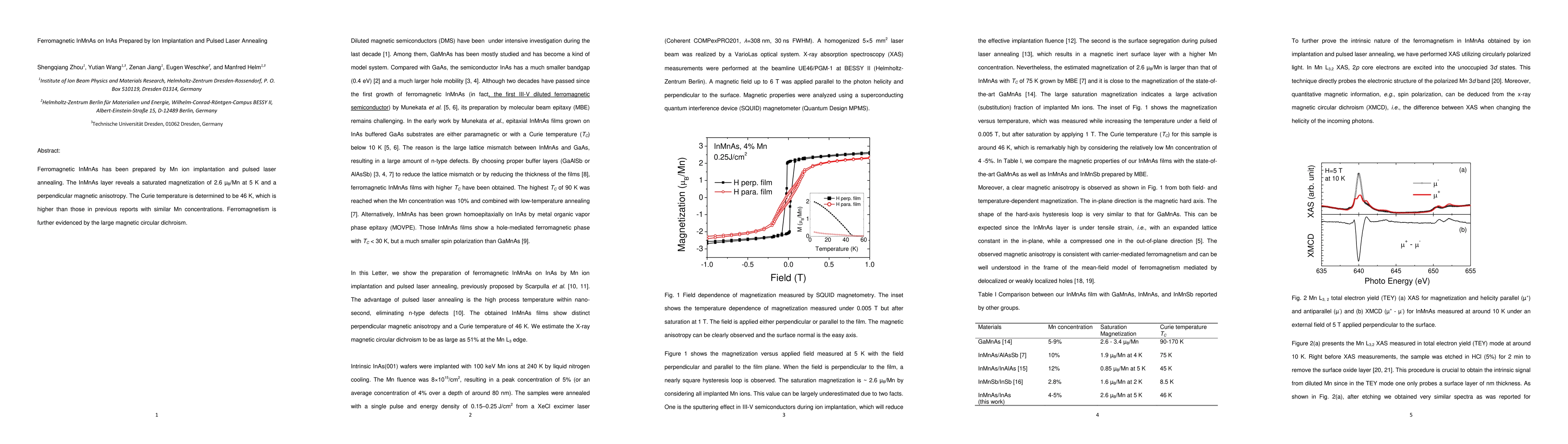 This study reports the preparation of ferromagnetic InMnAs via Mn ion implantation and pulsed laser annealing, achieving a high Curie temperature of 46 K and a saturated magnetization of 2.6 μB/Mn at 5 K, demonstrating enhanced magnetic properties compared to previous reports.
