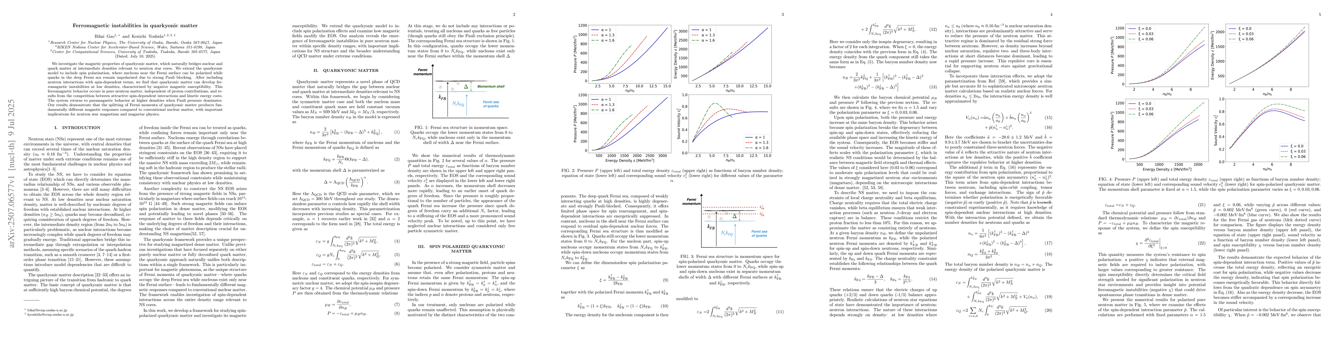 We investigate the magnetic properties of quarkyonic matter, which naturally bridges nuclear and quark matter at intermediate densities relevant to neutron star cores. We extend the quarkyonic model to include spin polarization, where nucleons near the Fermi surface can be polarized while quarks in the deep Fermi sea remain unpolarized due to strong Pauli blocking. After including neutron interactions with spin-dependent terms, we find that quarkyonic matter can develop ferromagnetic instabilities at low densities, characterized by negative magnetic susceptibility. This ferromagnetic behavior occurs in pure neutron matter, independent of proton contributions, and results from the competition between attractive spin-dependent interactions and kinetic energy costs. The system returns to paramagnetic behavior at higher densities when Pauli pressure dominates. Our results demonstrate that the splitting of Fermi momenta of quarkyonic matter produces fundamentally different magnetic responses compared to conventional nuclear matter, with important implications for neutron star magnetism and magnetar physics.
