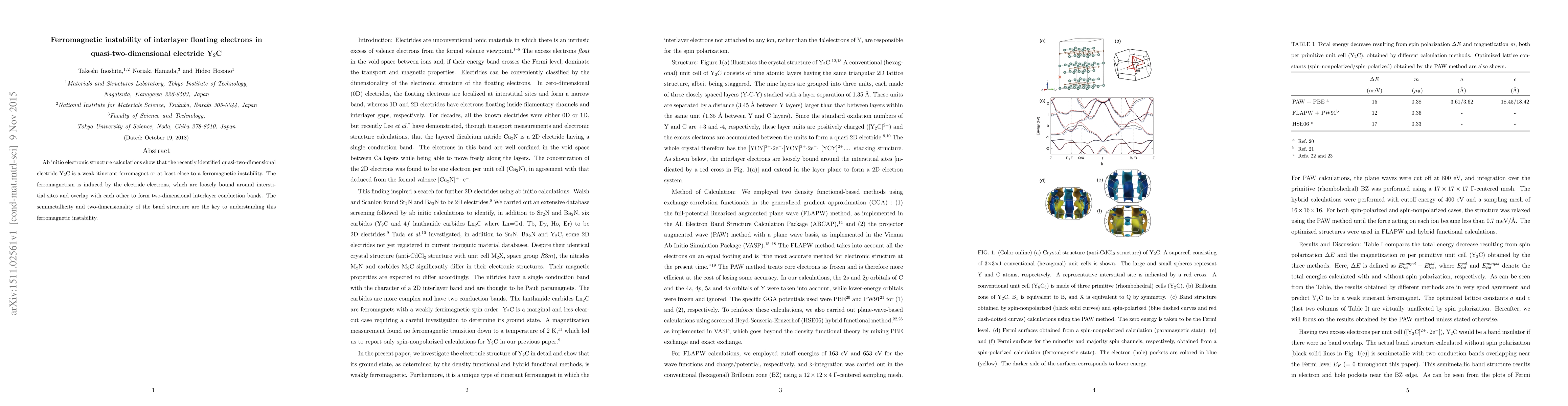 This study reveals that the quasi-two-dimensional electride Y$_2$C exhibits weak itinerant ferromagnetism due to interlayer floating electrons forming two-dimensional conduction bands, driven by semimetallicity and two-dimensional band overlap. The research highlights the ferromagnetic instability stemming from these unique electronic properties.