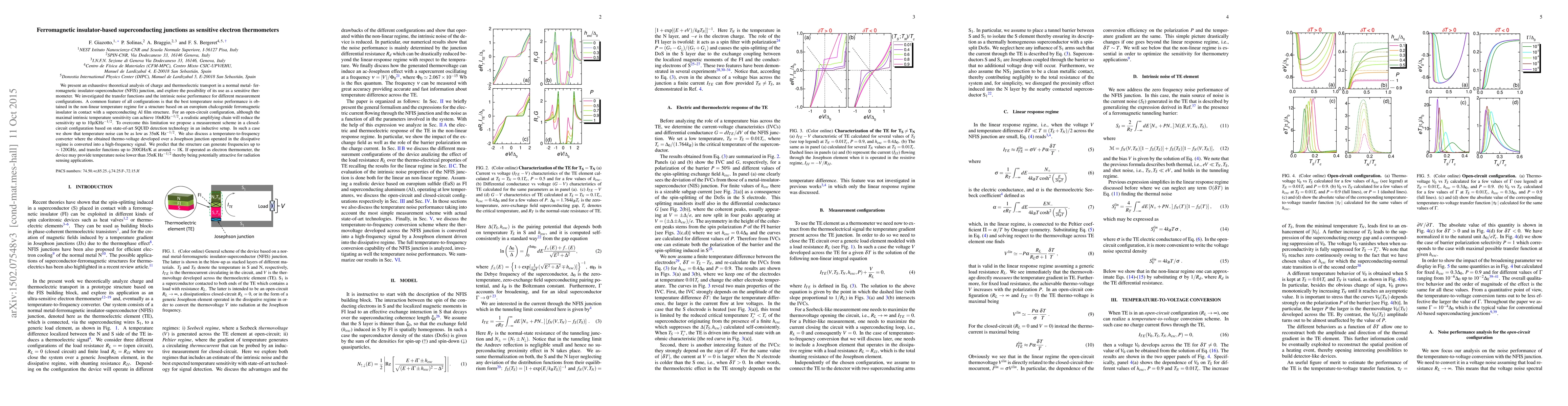 We present an exhaustive theoretical analysis of charge and thermoelectric transport in a normal metal-ferromagnetic insulator-superconductor (NFIS) junction, and explore the possibility of its use as a sensitive thermometer. We investigated the transfer functions and the intrinsic noise performance for different measurement configurations. A common feature of all configurations is that the best temperature noise performance is obtained in the non-linear temperature regime for a structure based on an europium chalcogenide ferromagnetic insulator in contact with a superconducting Al film structure. For an open-circuit configuration, although the maximal intrinsic temperature sensitivity can achieve $10$nKHz$^{-1/2}$, a realistic amplifying chain will reduce the sensitivity up to $10$$\mu$KHz$^{-1/2}$. To overcome this limitation we propose a measurement scheme in a closed-circuit configuration based on state-of-art SQUID detection technology in an inductive setup. In such a case we show that temperature noise can be as low as $35$nKHz$^{-1/2}$. We also discuss a temperature-to-frequency converter where the obtained thermo-voltage developed over a Josephson junction operated in the dissipative regime is converted into a high-frequency signal. We predict that the structure can generate frequencies up to $\sim 120$GHz, and transfer functions up to $200$GHz/K at around $\sim 1$K. If operated as electron thermometer, the device may provide temperature noise lower than $35$nKHz$^{-1/2}$ thereby being potentially attractive for radiation sensing applications.