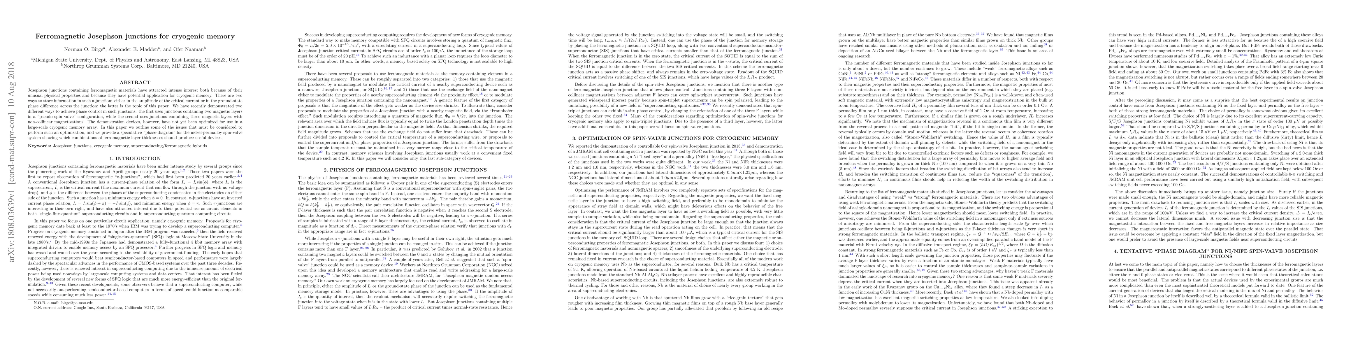 This paper explores the potential of ferromagnetic Josephson junctions for cryogenic memory applications, focusing on the phase difference across the junction for information storage. It discusses two demonstrated methods for phase control, and outlines optimization challenges and a speculative phase-diagram for nickel-permalloy spin-valve systems to guide device development.