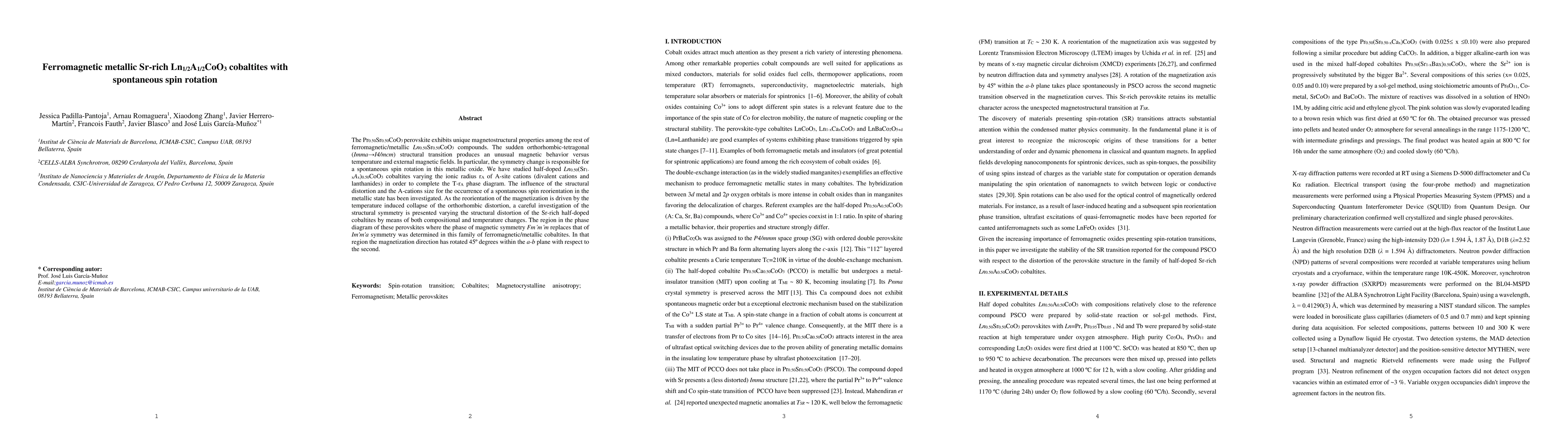 Researchers studied ferromagnetic metallic Sr-rich cobaltites with spontaneous spin rotation, finding a 45-degree magnetization direction shift in the a-b plane at certain temperatures.