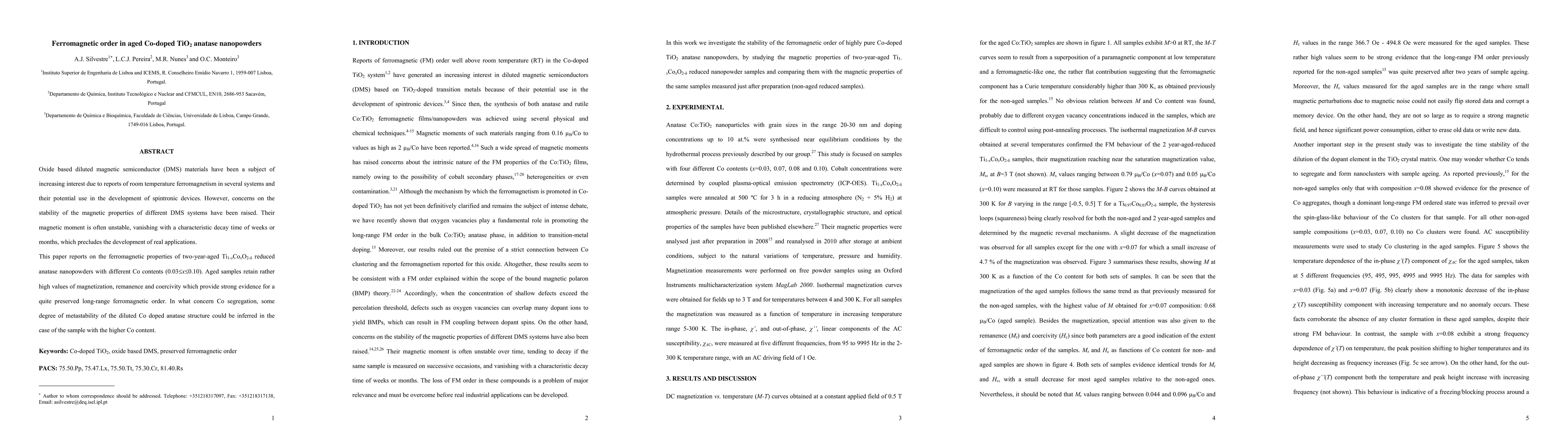 This paper investigates the long-term stability of ferromagnetic properties in aged Co-doped TiO2 anatase nanopowders, finding that two-year-old samples maintain high magnetization, remanence, and coercivity, indicating stable long-range ferromagnetic order despite some Co segregation in higher Co content samples.