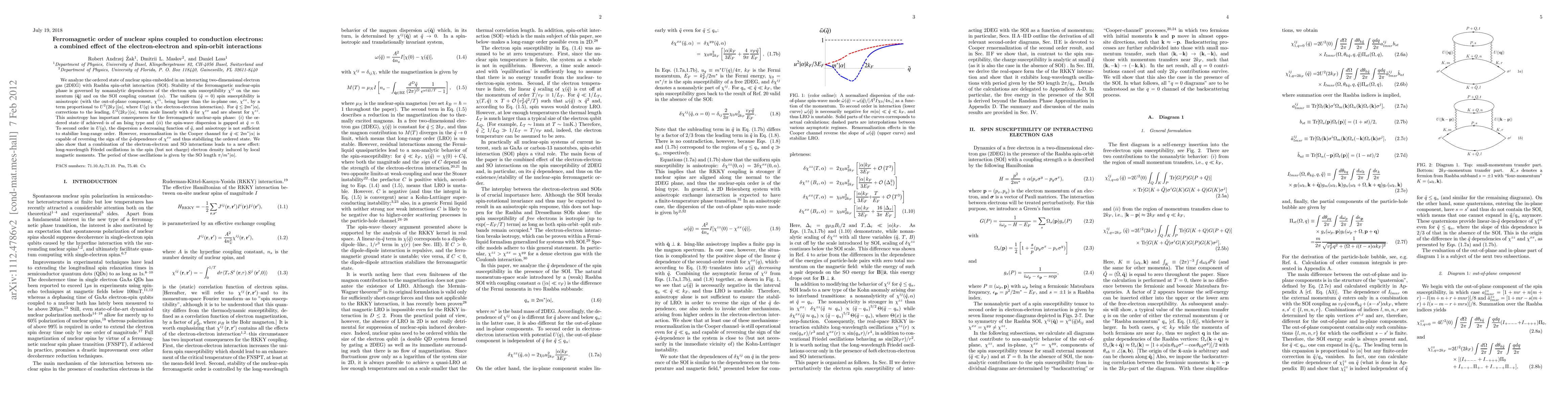 We analyze the ordered state of nuclear spins embedded in an interacting two-dimensional electron gas (2DEG) with Rashba spin-orbit interaction (SOI). Stability of the ferromagnetic nuclear-spin phase is governed by nonanalytic dependences of the electron spin susceptibility $\chi^{ij}$ on the momentum ($\tilde{\mathbf{q}}$) and on the SOI coupling constant ($\alpha$). The uniform ($\tq=0$) spin susceptibility is anisotropic (with the out-of-plane component, $\chi^{zz}$, being larger than the in-plane one, $\chi^{xx}$, by a term proportional to $U^2(2k_F)|\alpha|$, where $U(q)$ is the electron-electron interaction). For $\tq \leq 2m^*|\alpha|$, corrections to the leading, $U^2(2k_F)|\alpha|$, term scale linearly with $\tq$ for $\chi^{xx}$ and are absent for $\chi^{zz}$. This anisotropy has important consequences for the ferromagnetic nuclear-spin phase: $(i)$ the ordered state--if achieved--is of an Ising type and $(ii)$ the spin-wave dispersion is gapped at $\tq=0$. To second order in $U(q)$, the dispersion a decreasing function of $\tq$, and anisotropy is not sufficient to stabilize long-range order. However, renormalization in the Cooper channel for $\tq\ll2m^*|\alpha|$ is capable of reversing the sign of the $\tq$-dependence of $\chi^{xx}$ and thus stabilizing the ordered state. We also show that a combination of the electron-electron and SO interactions leads to a new effect: long-wavelength Friedel oscillations in the spin (but not charge) electron density induced by local magnetic moments. The period of these oscillations is given by the SO length $\pi/m^*|\alpha|$.