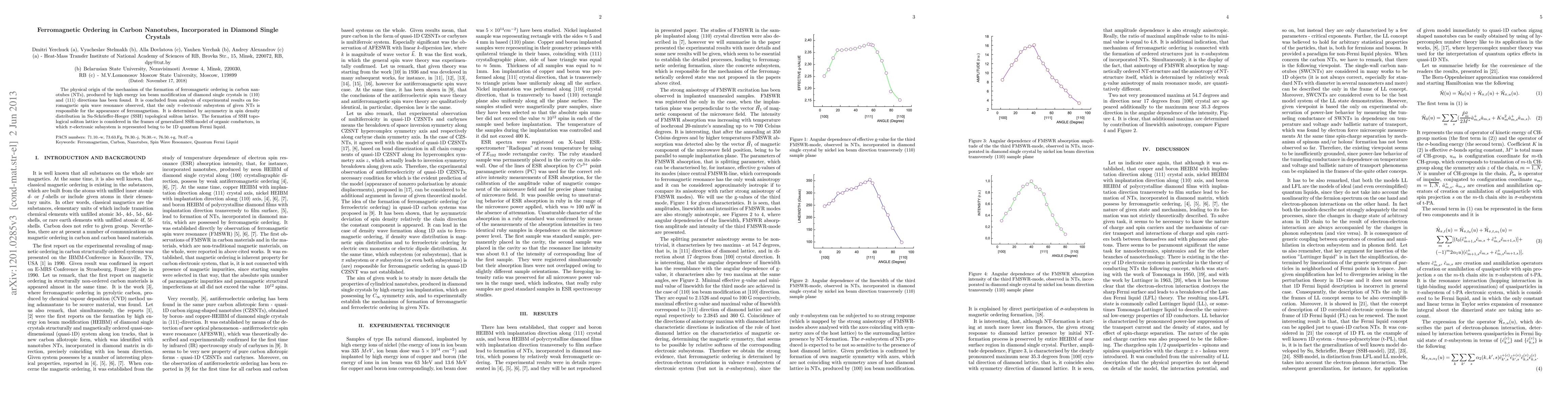 This paper investigates the ferromagnetic ordering in carbon nanotubes embedded in diamond single crystals, attributing it to the $\pi$-electronic subsystem's asymmetry in a Su-Schrieffer-Heeger topological soliton lattice. Additionally, it explores the coexistence of uncompensated antiferromagnetic ordering and superconductivity in similar nanotubes under different ion beam modification directions.