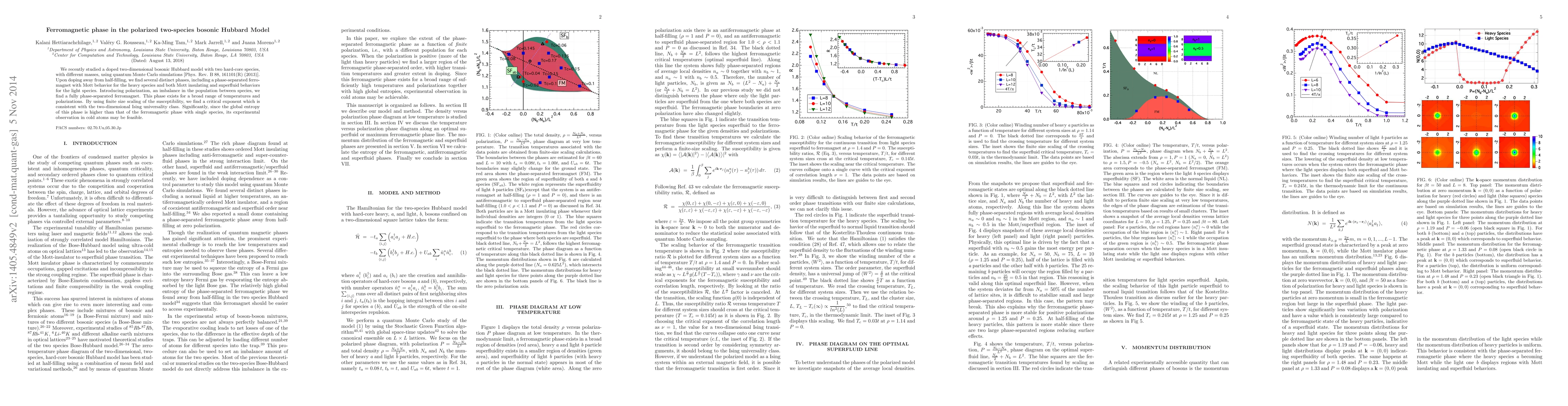 We recently studied a doped two-dimensional bosonic Hubbard model with two hard-core species, with different masses, using quantum Monte Carlo simulations [Phys. Rev. B 88, 161101(R) (2013)]. Upon doping away from half-filling, we find several distinct phases, including a phase-separated ferromagnet with Mott behavior for the heavy species and both Mott insulating and superfluid behaviors for the light species. Introducing polarization, an imbalance in the population between species, we find a fully phase-separated ferromagnet. This phase exists for a broad range of temperatures and polarizations. By using finite size scaling of the susceptibility, we find a critical exponent which is consistent with the two-dimensional Ising universality class. Significantly, since the global entropy of this phase is higher than that of the ferromagnetic phase with single species, its experimental observation in cold atoms may be feasible.