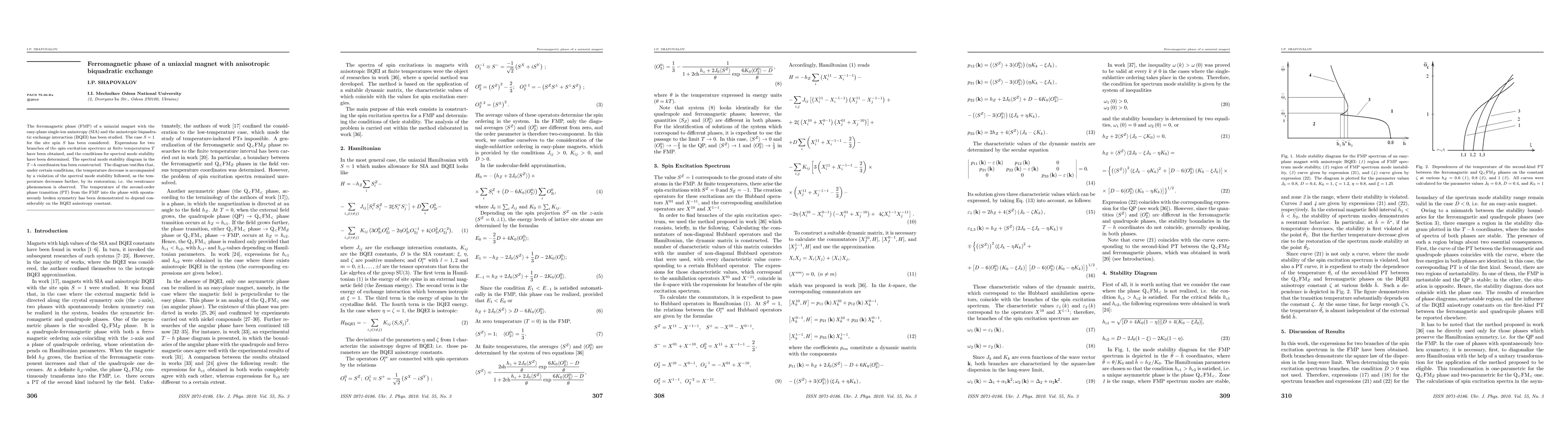 The ferromagnetic phase (FMP) of a uniaxial magnet with the easy-plane single-ion anisotropy (SIA) and the anisotropic biquadra\-tic exchange interaction (BQEI) has been studied. The case $S=1$ for the site spin $S$ has been considered. Expressions for two branches of the spin excitation spectrum at finite temperatures $T$ have been obtained, and the conditions for spectral mode stability have been determined. The spectral mode stability diagram in the $T-h$ coordinates has been constructed. The diagram testifies that, under certain conditions, the temperature decrease is accompanied by a violation of the spectral mode stability followed, as the temperature decreases further, by its restoration; i.e. the reentrance phenomenon is observed. The temperature of the second-order phase transition (PT) from the FMP into the phase with spontaneously broken symmetry has been demonstrated to depend considerably on the BQEI anisotropy constant.