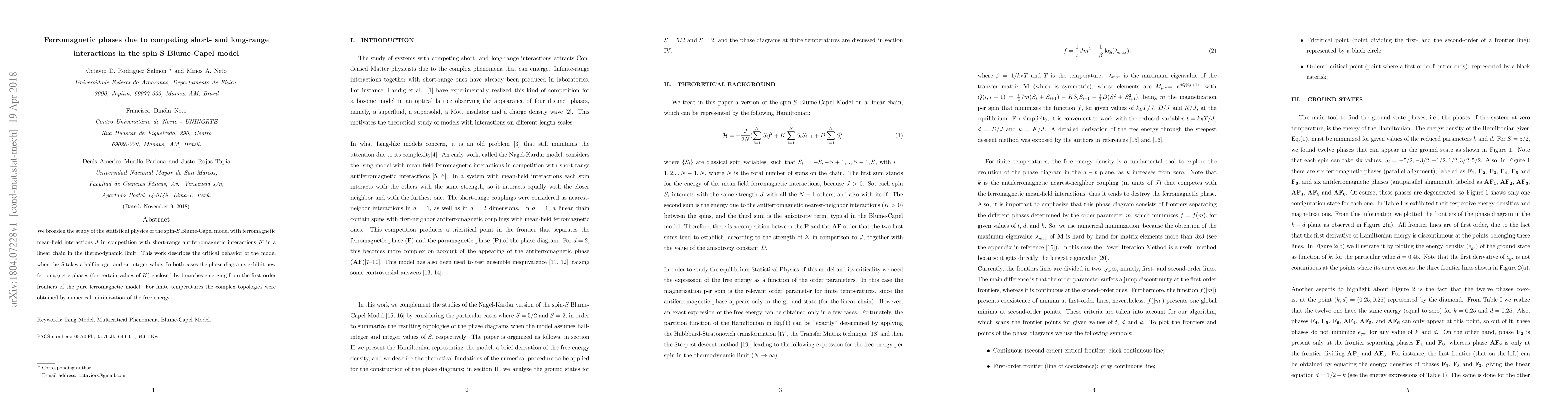 The work distinguishes itself by examining the competition between mean-field ferromagnetic interactions and short-range antiferromagnetic interactions in the Blume-Capel model, revealing novel ferromagnetic phases and intricate phase diagram topologies for both half-integer and integer spin values.